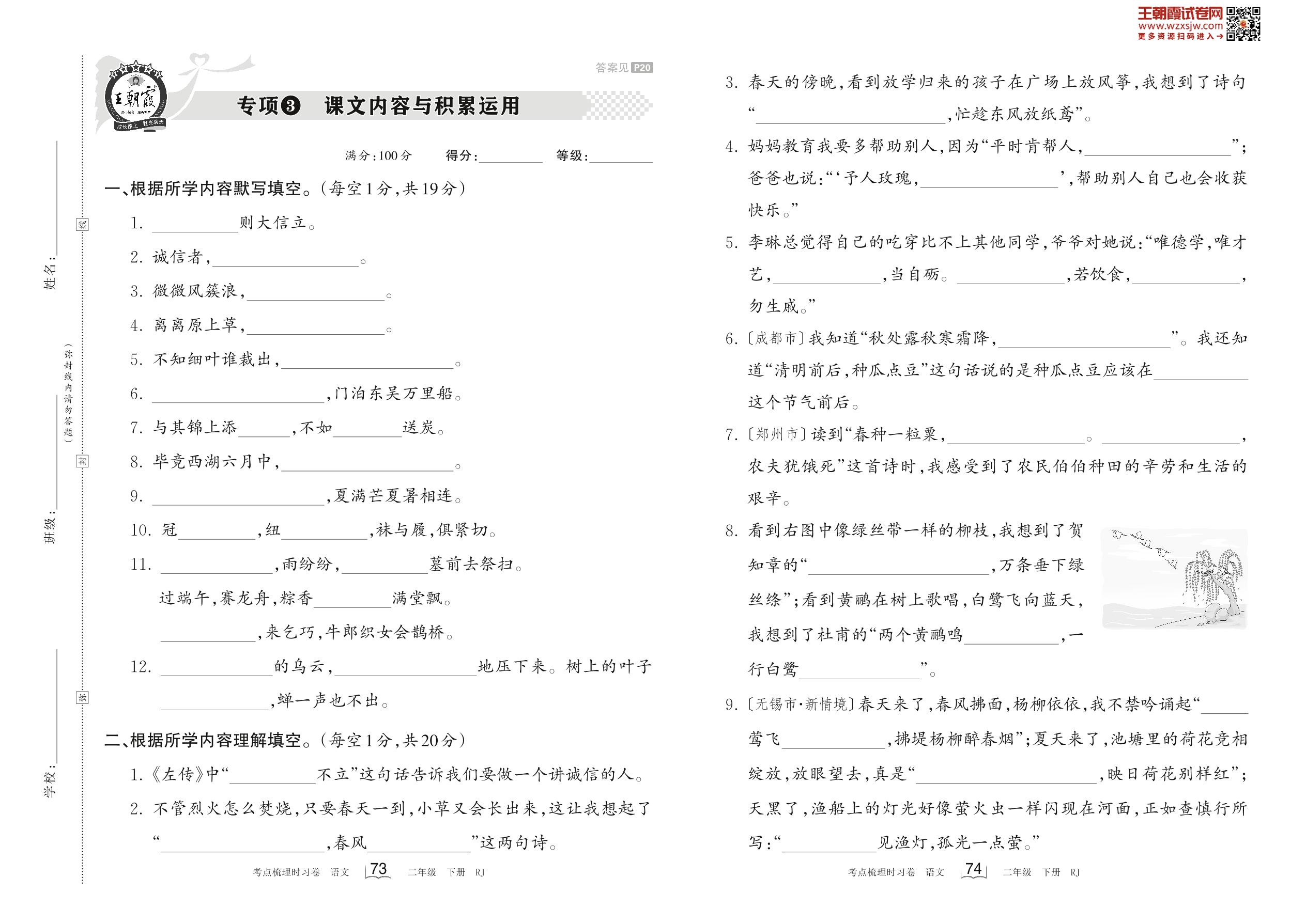 2023下册二年级语文人教版 专项3 课文内容与积累运用