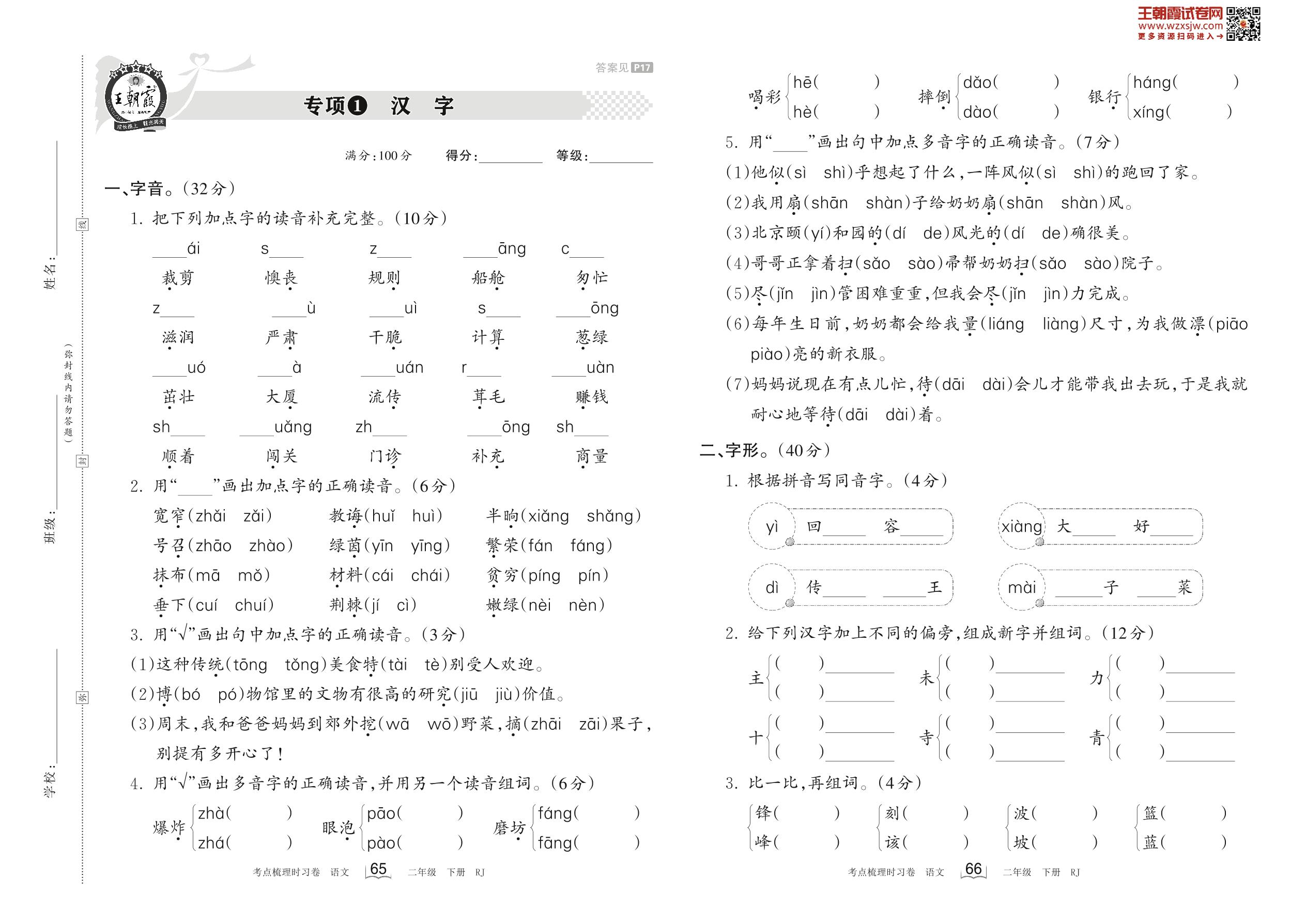 2023下册二年级语文人教版 专项1 汉字