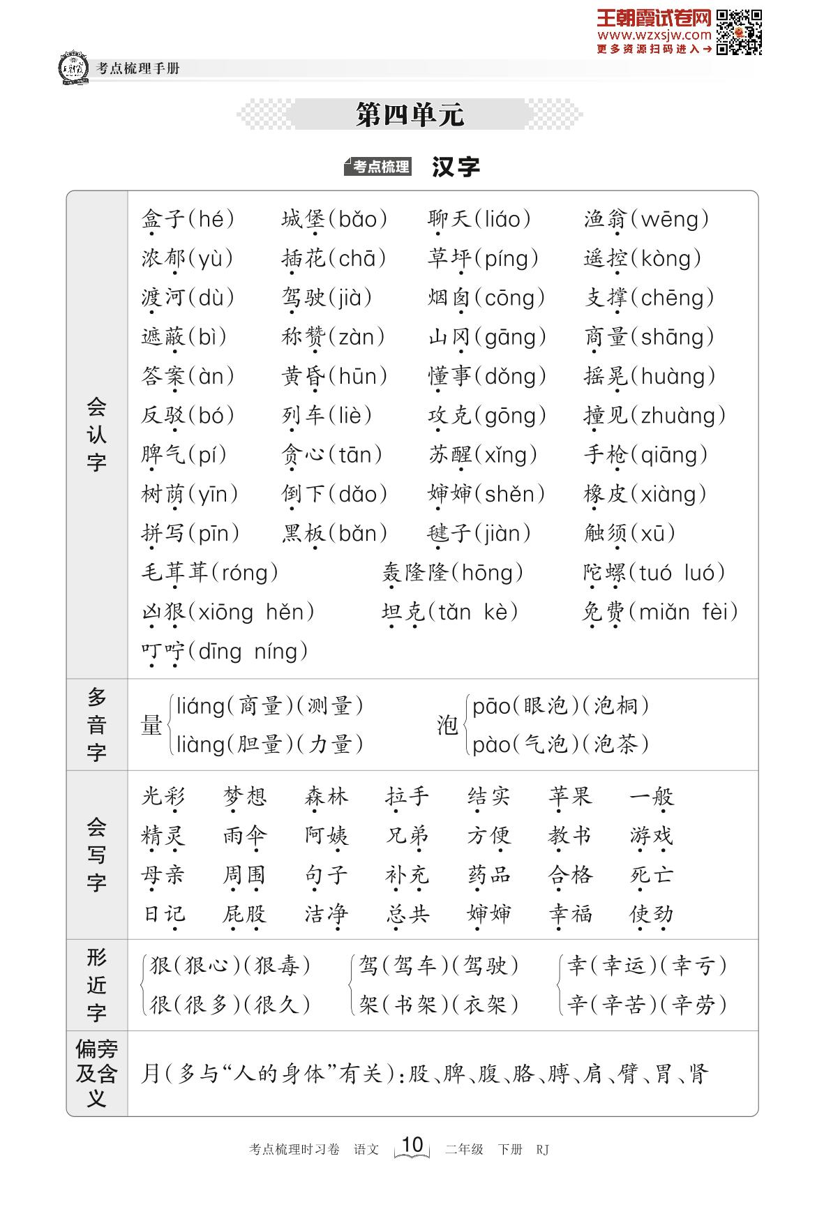 2023下册二年级语文人教版 考点梳理手册——第四单元