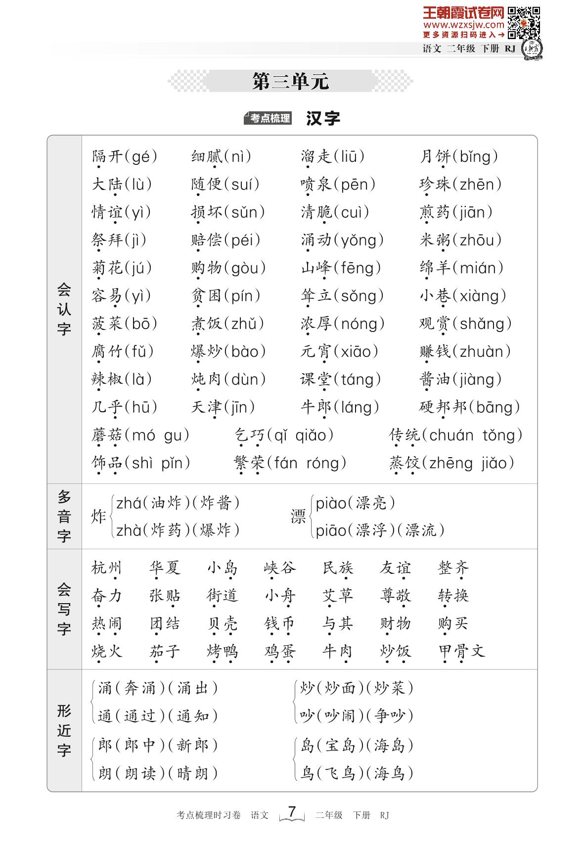 2023下册二年级语文人教版 考点梳理手册——第三单元