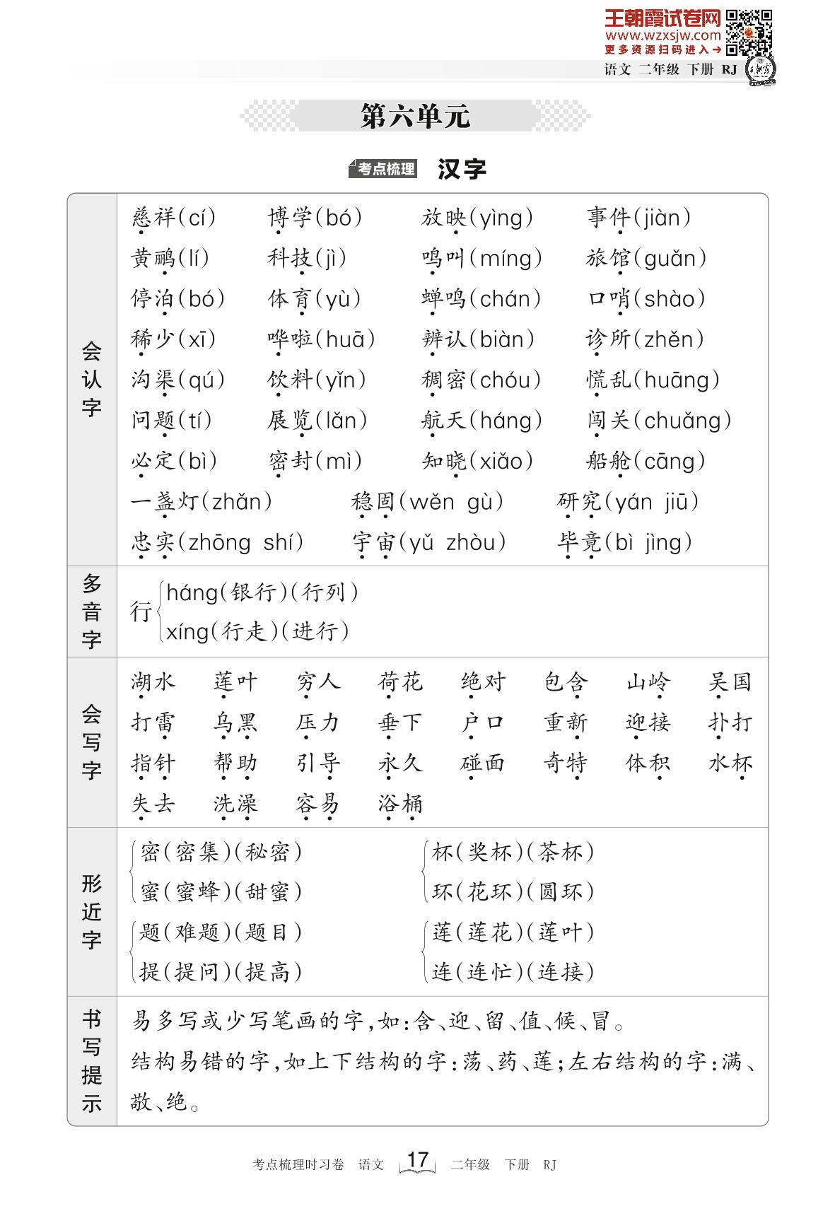 2023下册二年级语文人教版 考点梳理手册——第六单元