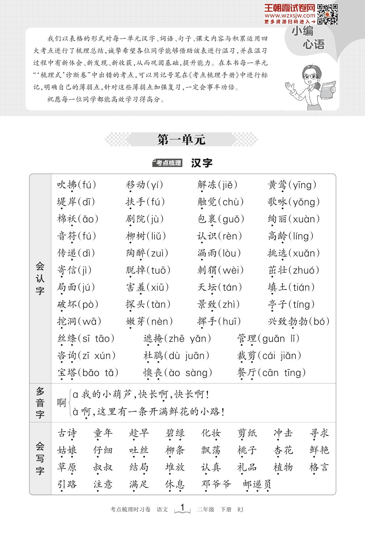 2023下册二年级语文人教版 考点梳理手册——第一单元