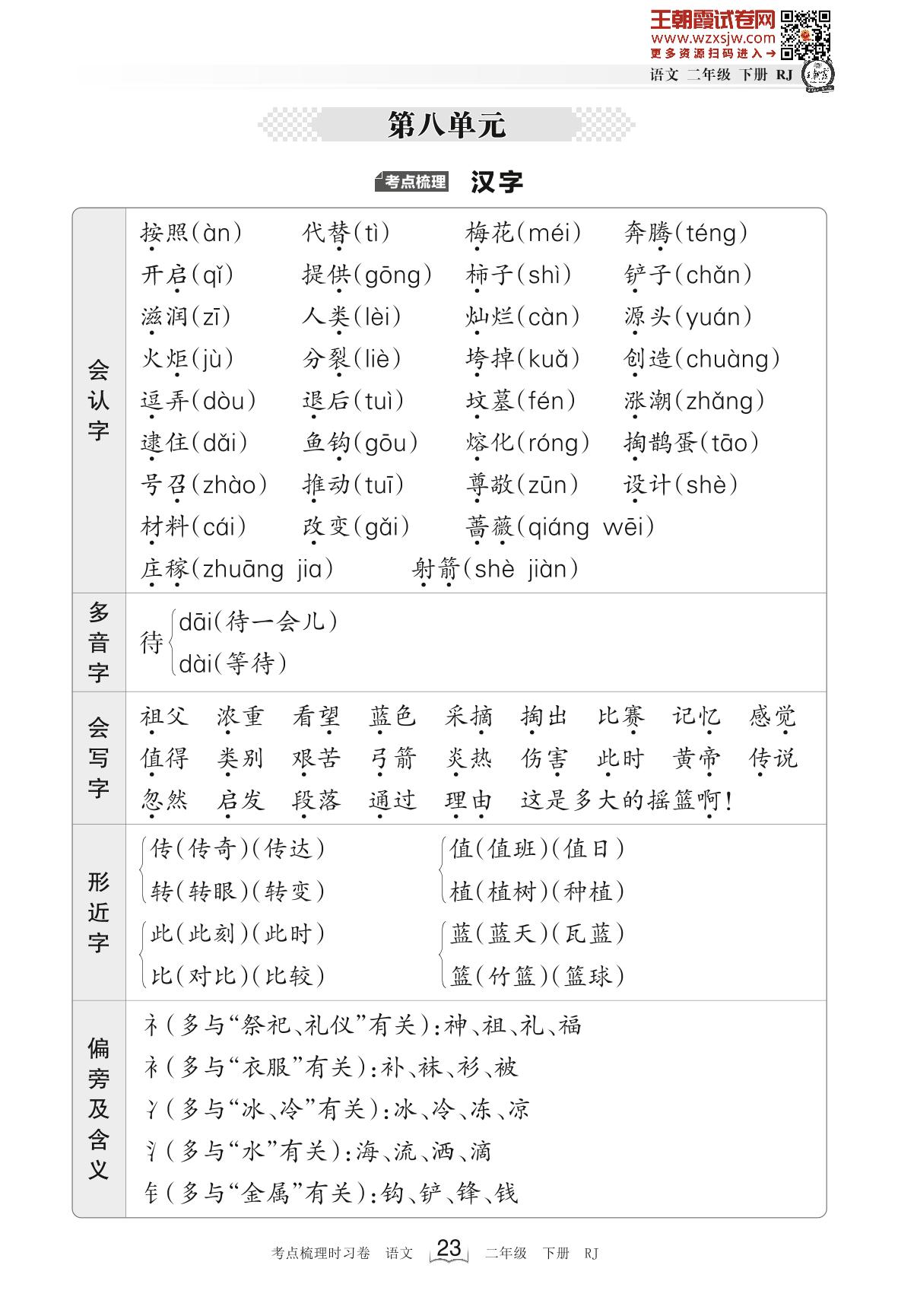 2023下册二年级语文人教版 考点梳理手册——第八单元