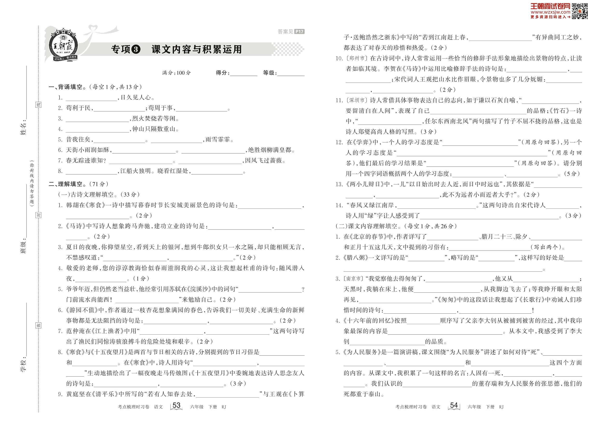 2023下册六年级语文人教版 专项3 课文内容与积累运用