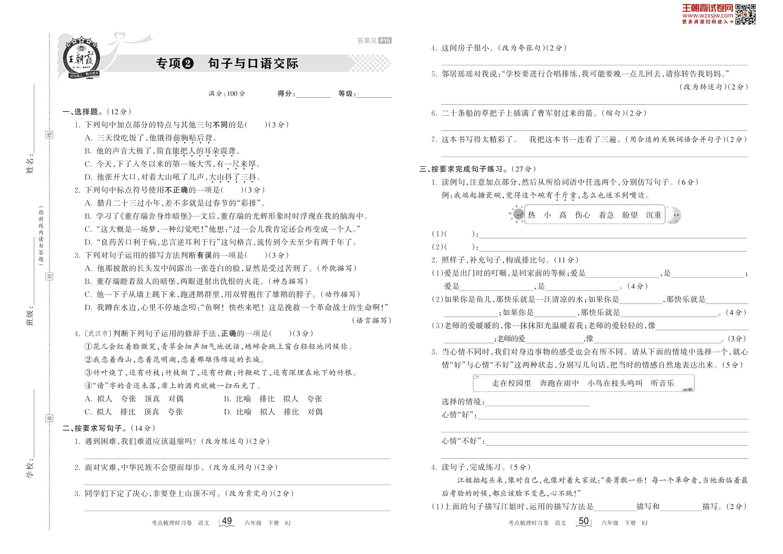 2023下册六年级语文人教版 专项2 句子与口语交际