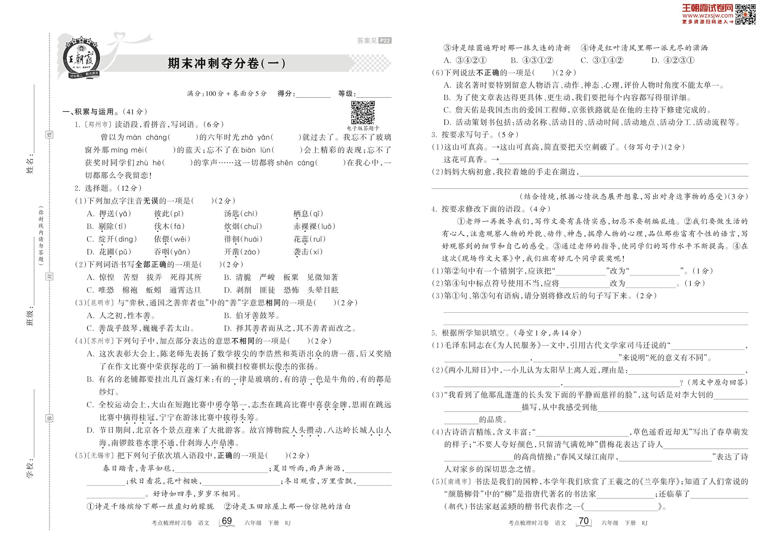 2023下册六年级语文人教版 期末冲刺夺分卷(一)