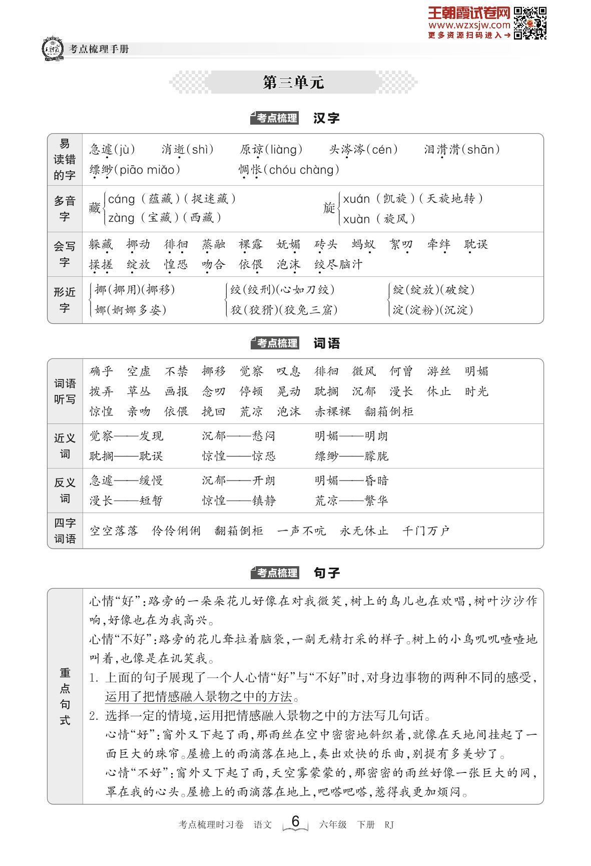 2023下册六年级语文人教版 考点梳理手册——第三单元