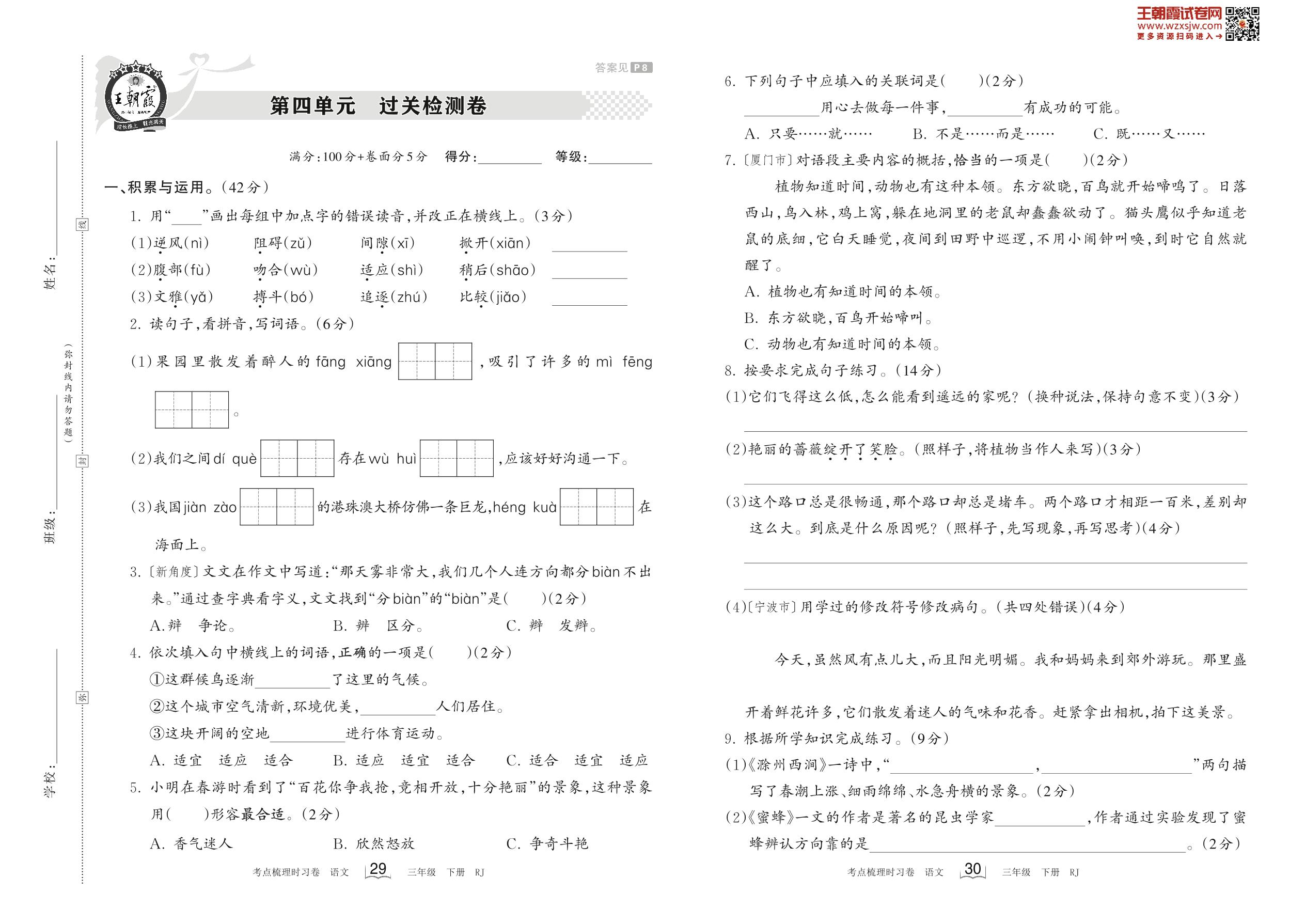 2023下册三年级语文人教版 第四单元 过关检测卷