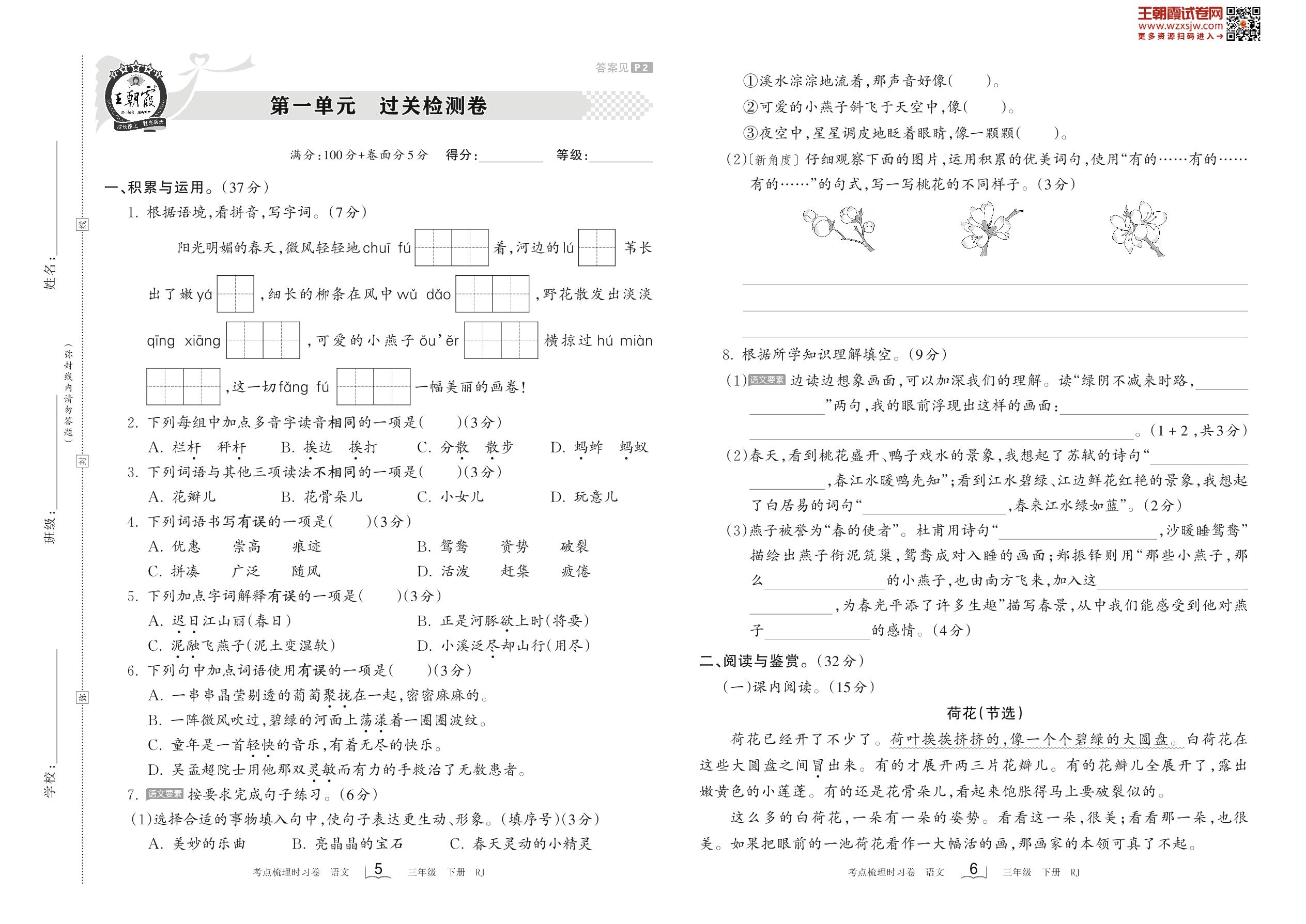 2023下册三年级语文人教版 第一单元 过关检测卷