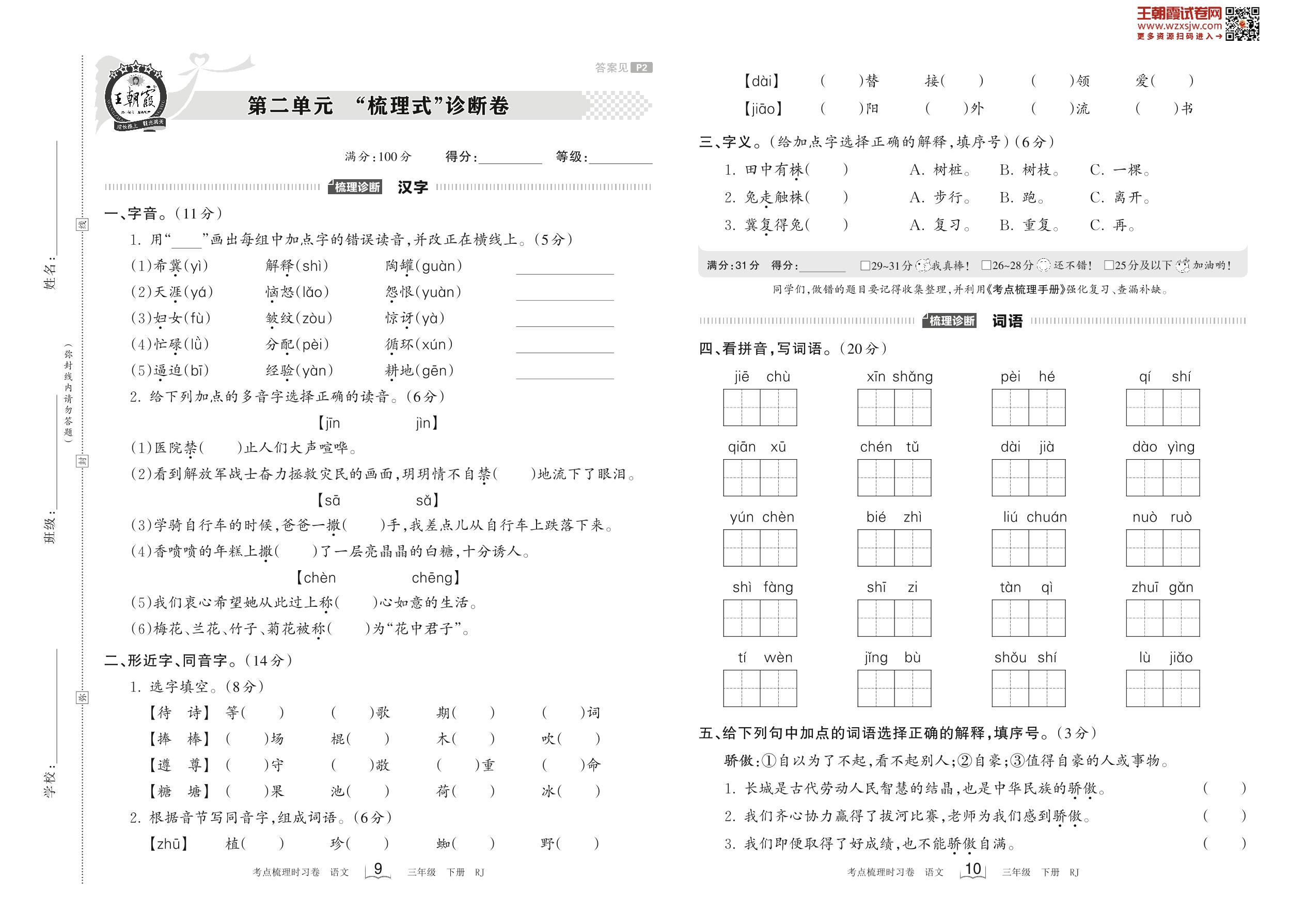2023下册三年级语文人教版 第二单元 “梳理式”诊断卷