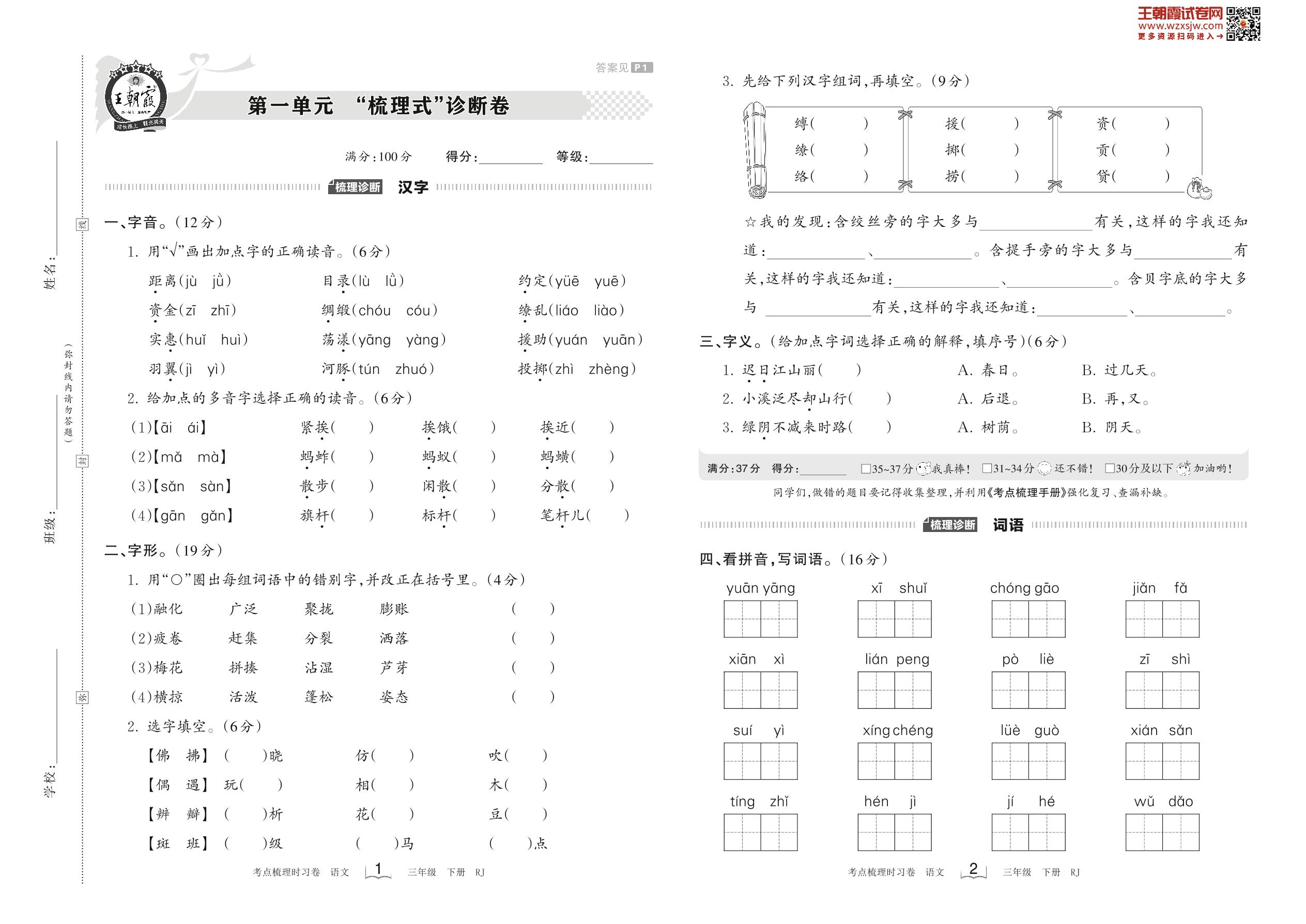 2023下册三年级语文人教版 第一单元 “梳理式”诊断卷