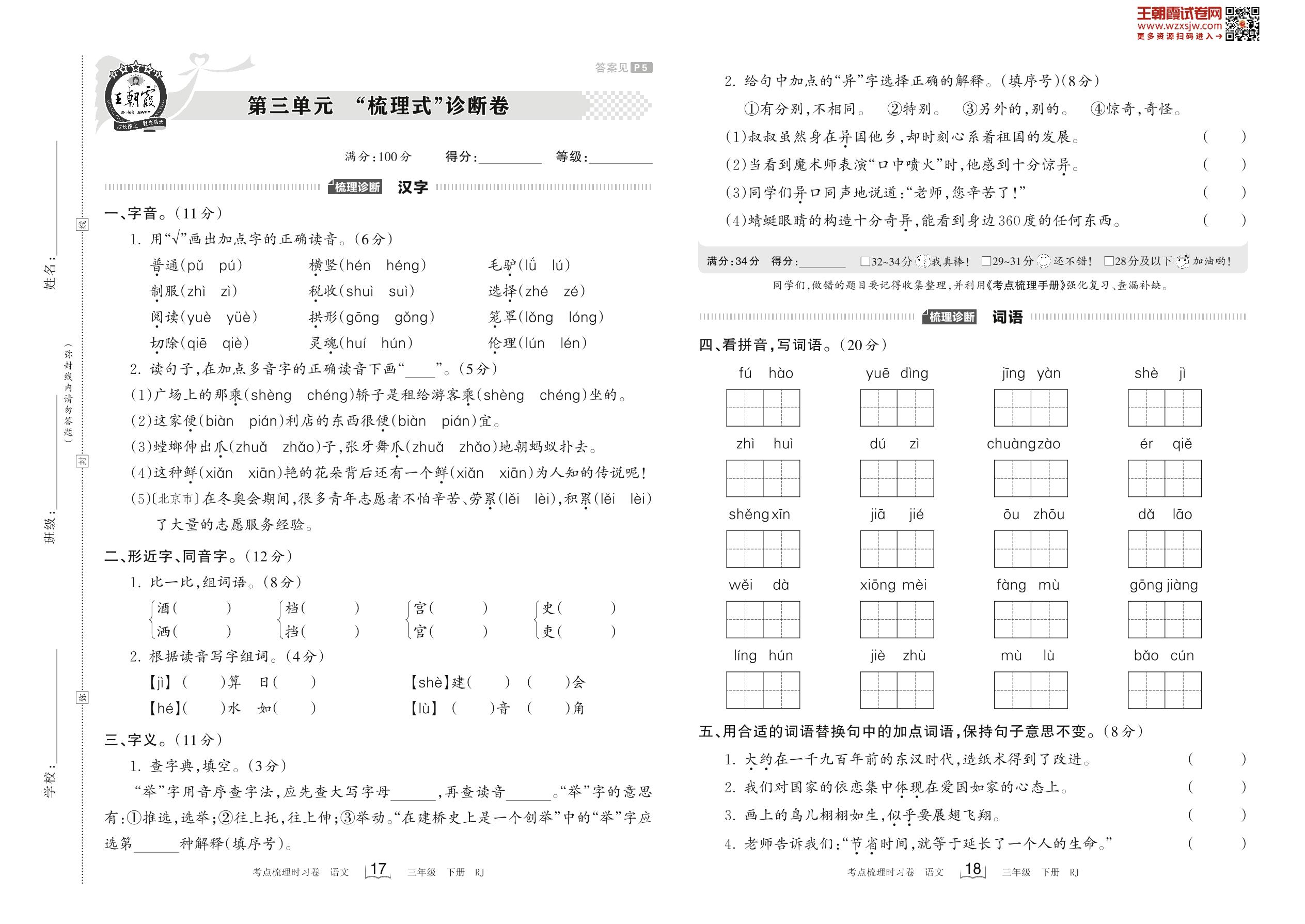 2023下册三年级语文人教版 第三单元 “梳理式”诊断卷