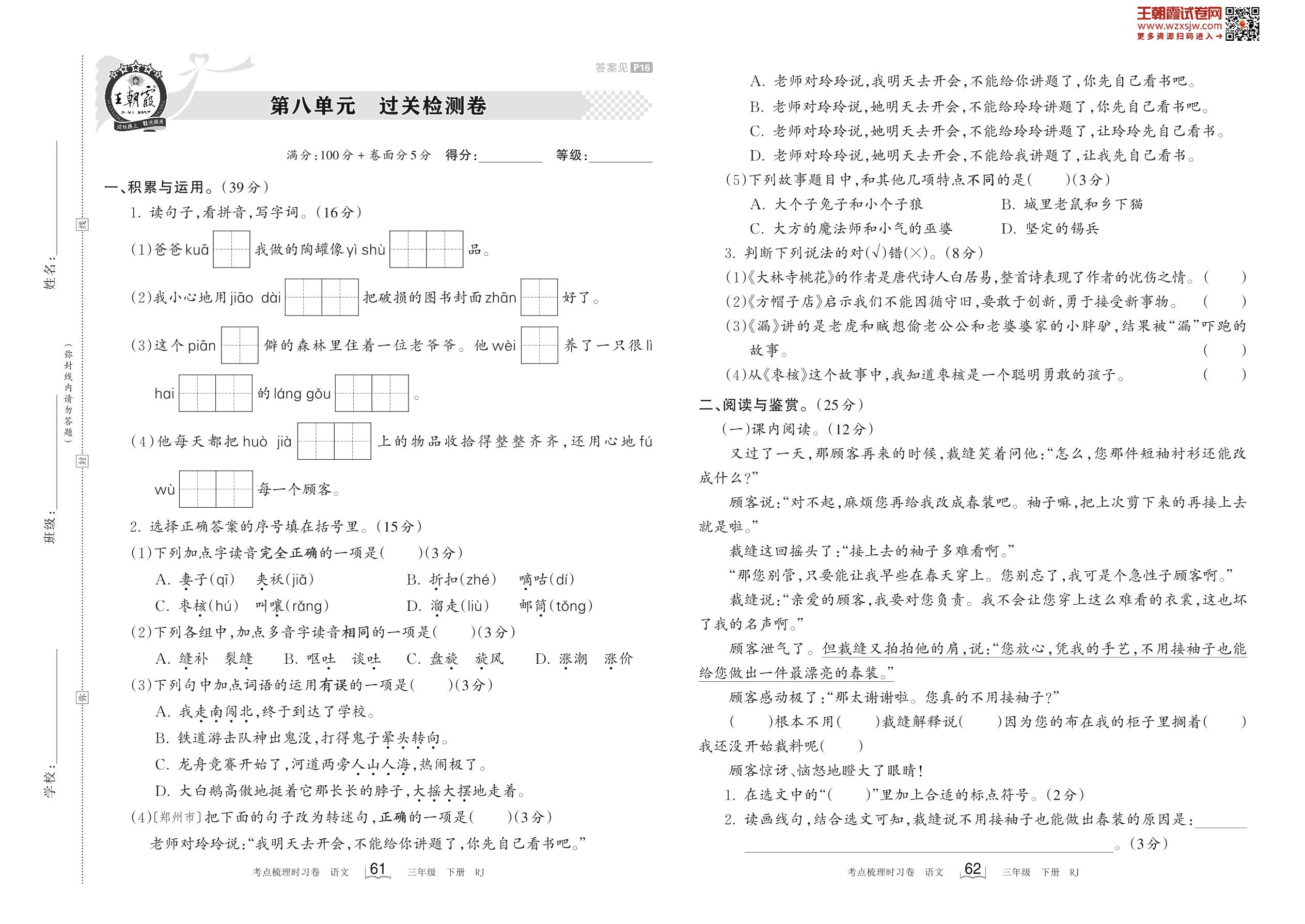 2023下册三年级语文人教版 第八单元 过关检测卷