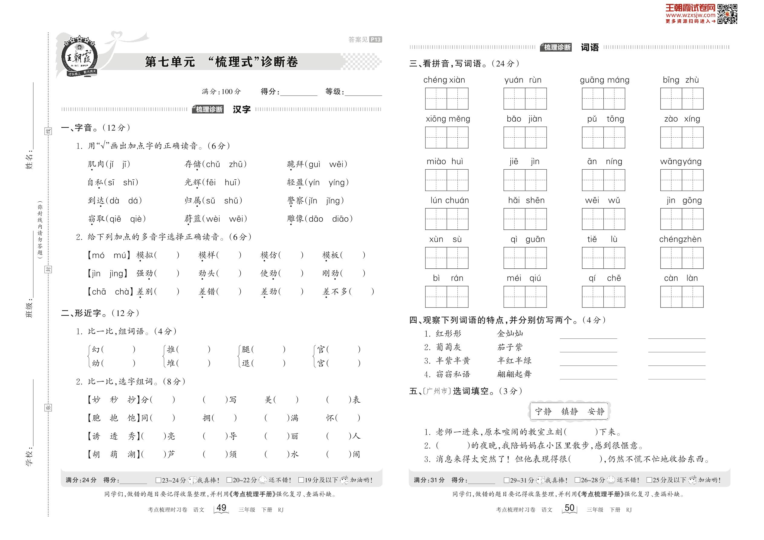 2023下册三年级语文人教版 第七单元 “梳理式”诊断卷