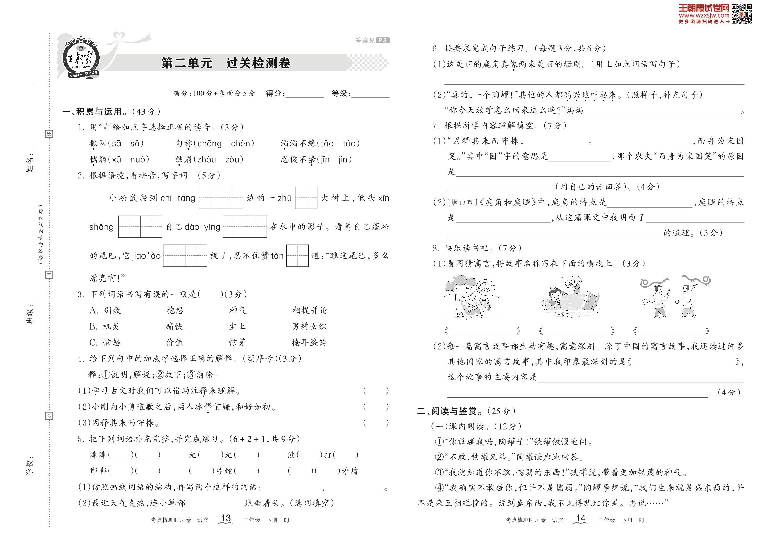 2023下册三年级语文人教版 第二单元 过关检测卷