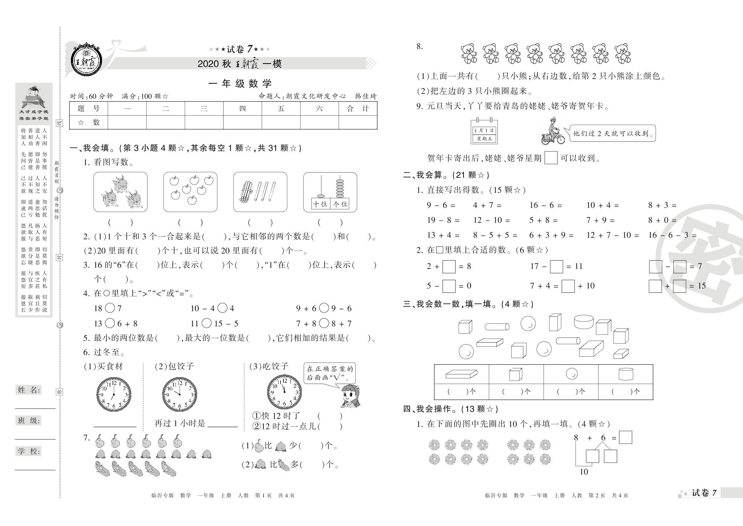 王朝霞期末模拟卷一年级上册数学(人教版)_R210802211717【7】