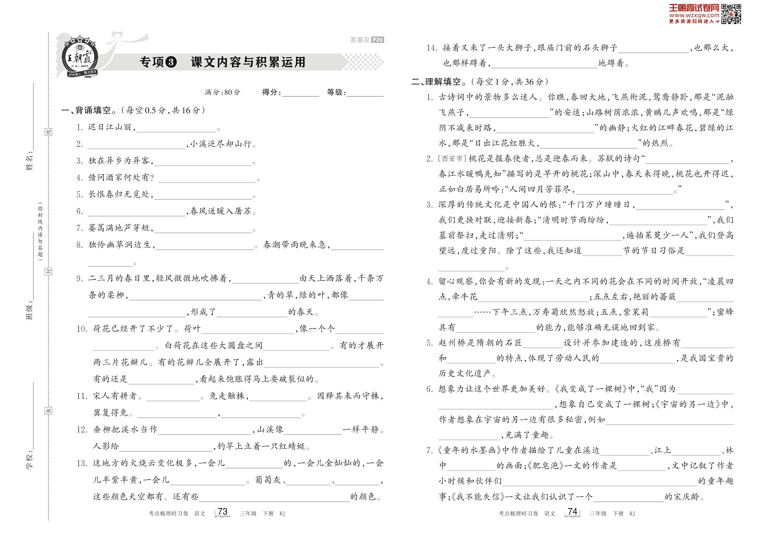 2023下册三年级语文人教版 专项3 课文内容与积累运用