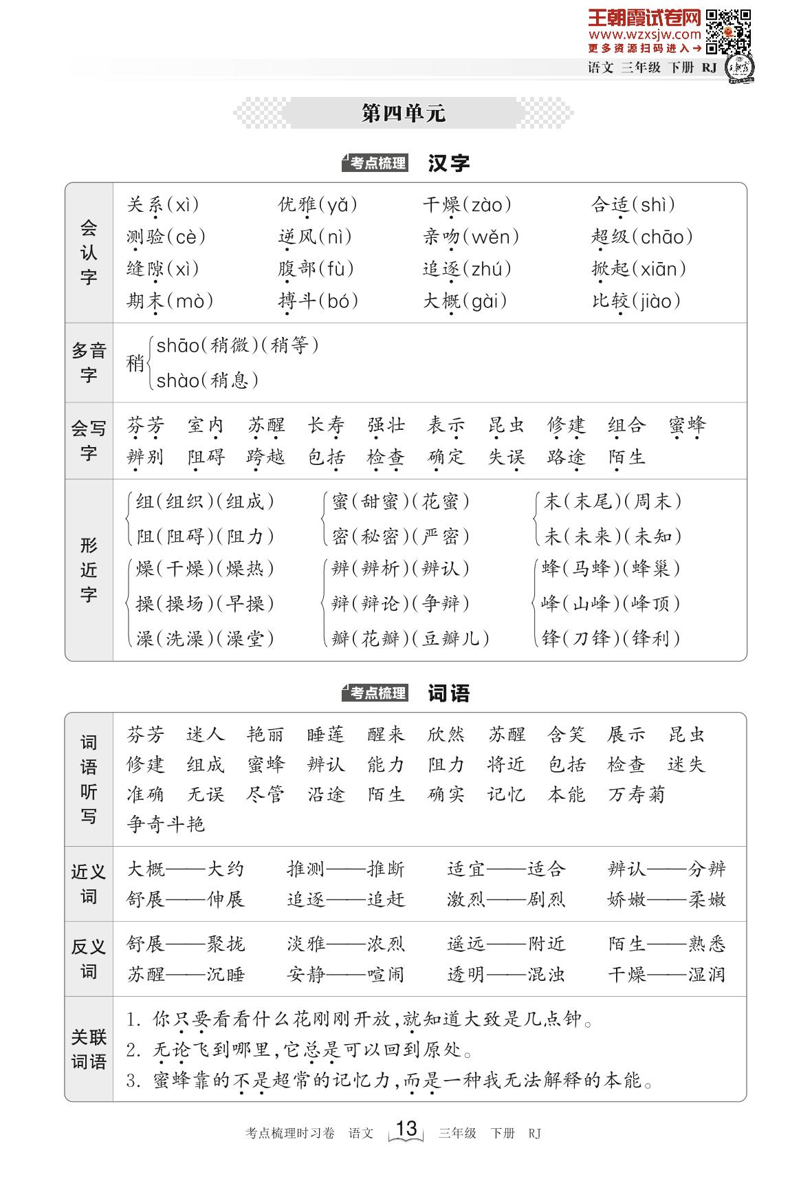 2023下册三年级语文人教版 考点梳理手册——第四单元