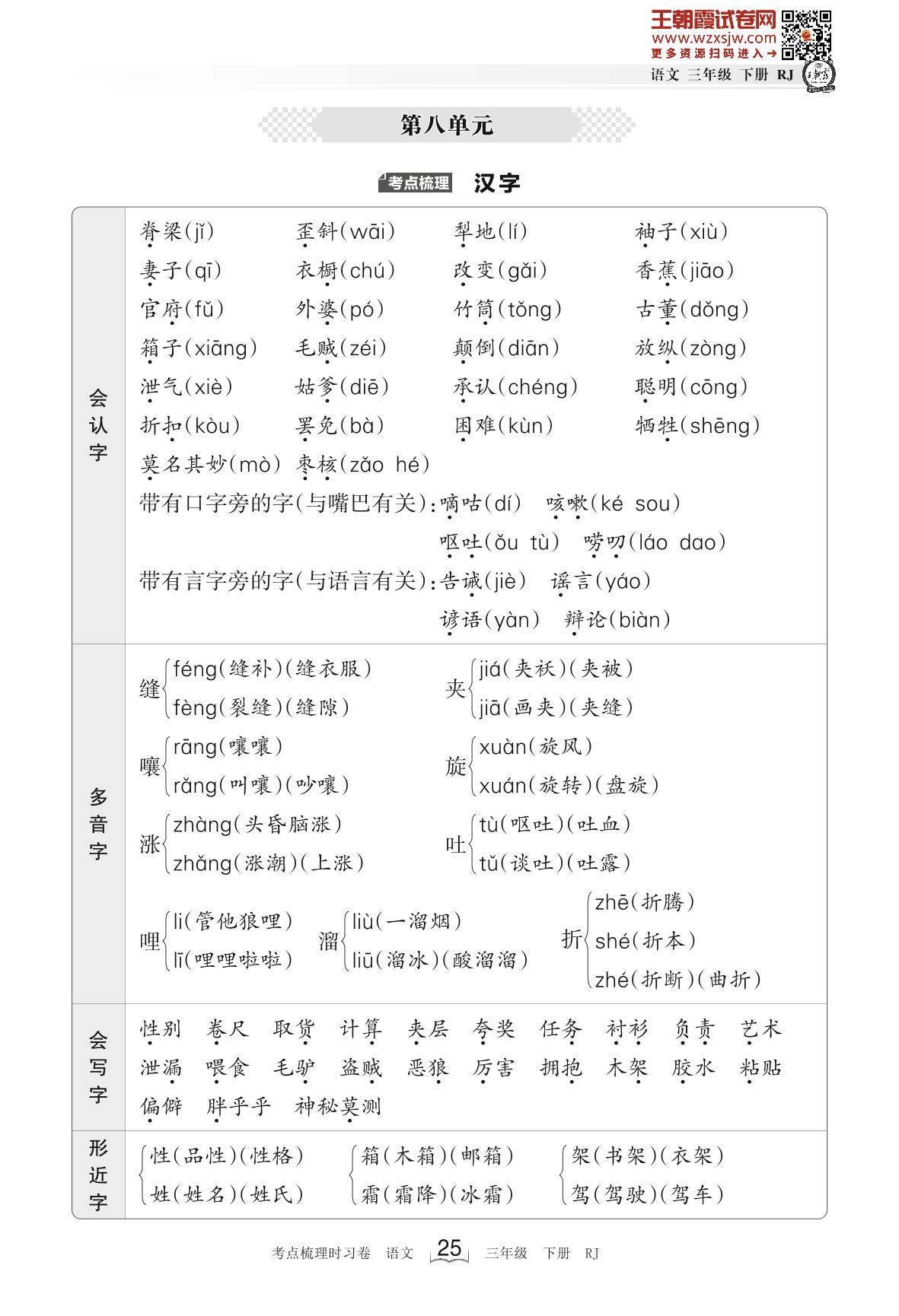 2023下册三年级语文人教版 考点梳理手册——第八单元