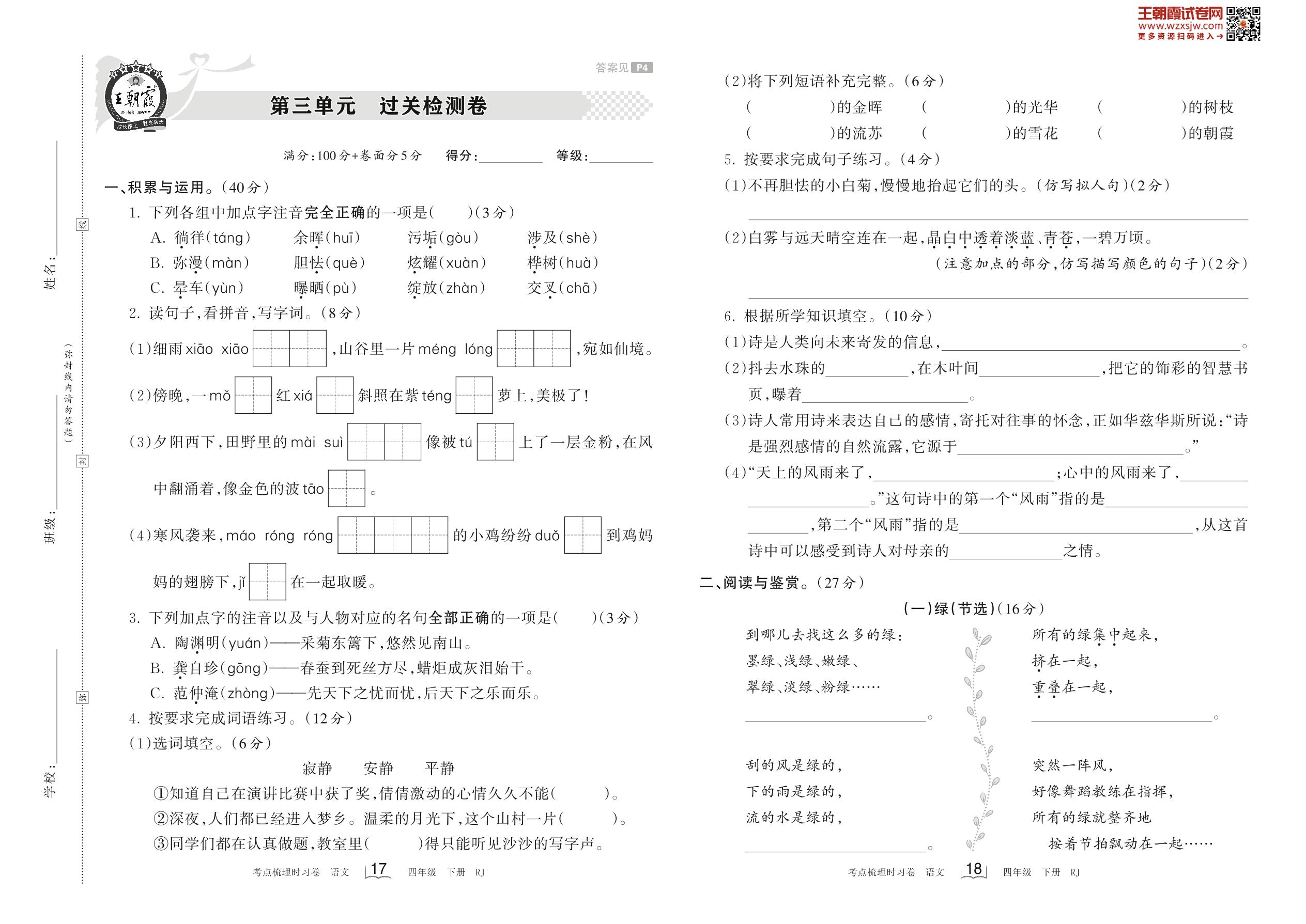 2023下册四年级语文人教版 第三单元 过关检测卷