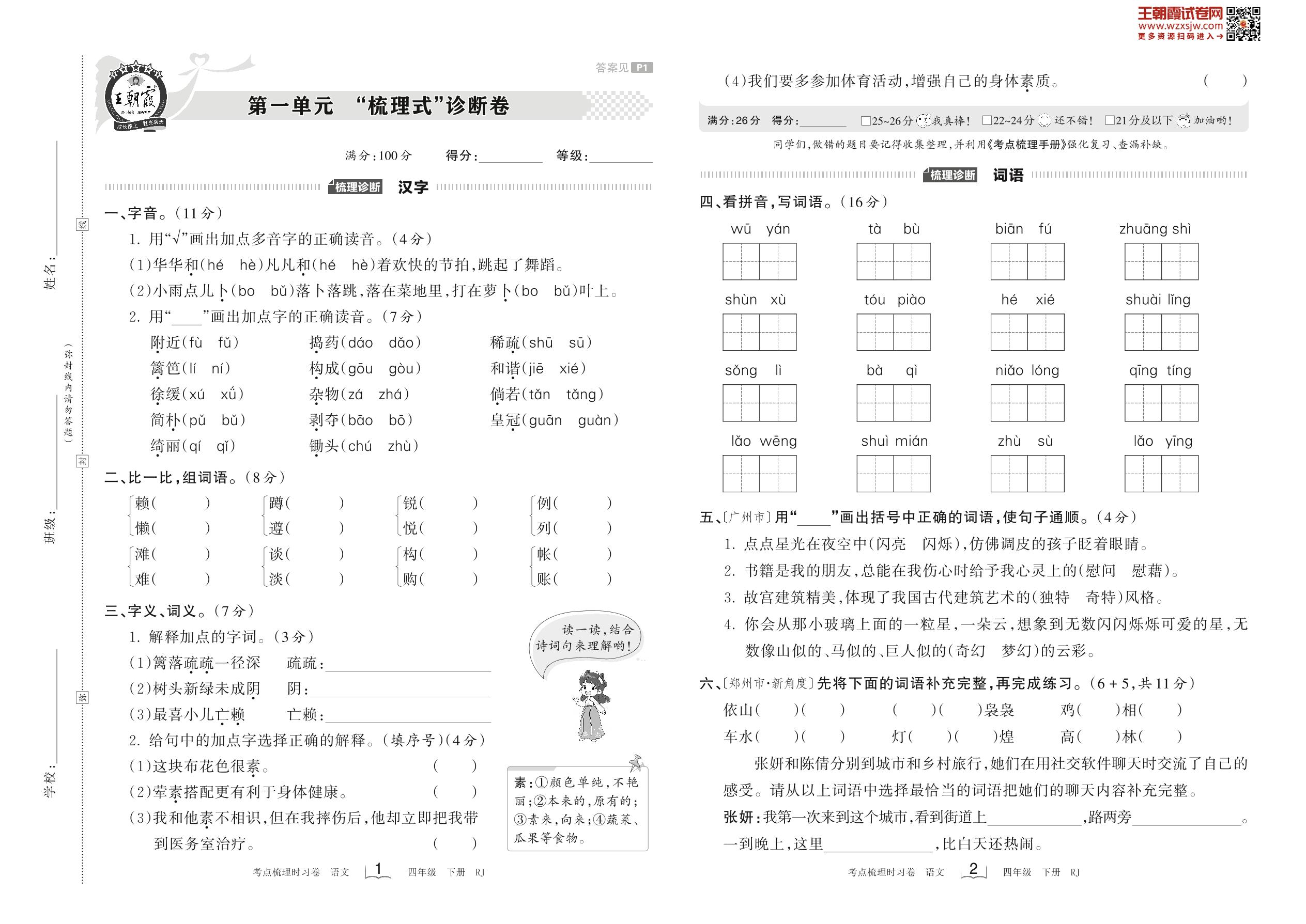 2023下册四年级语文人教版 第一单元 “梳理式”诊断卷