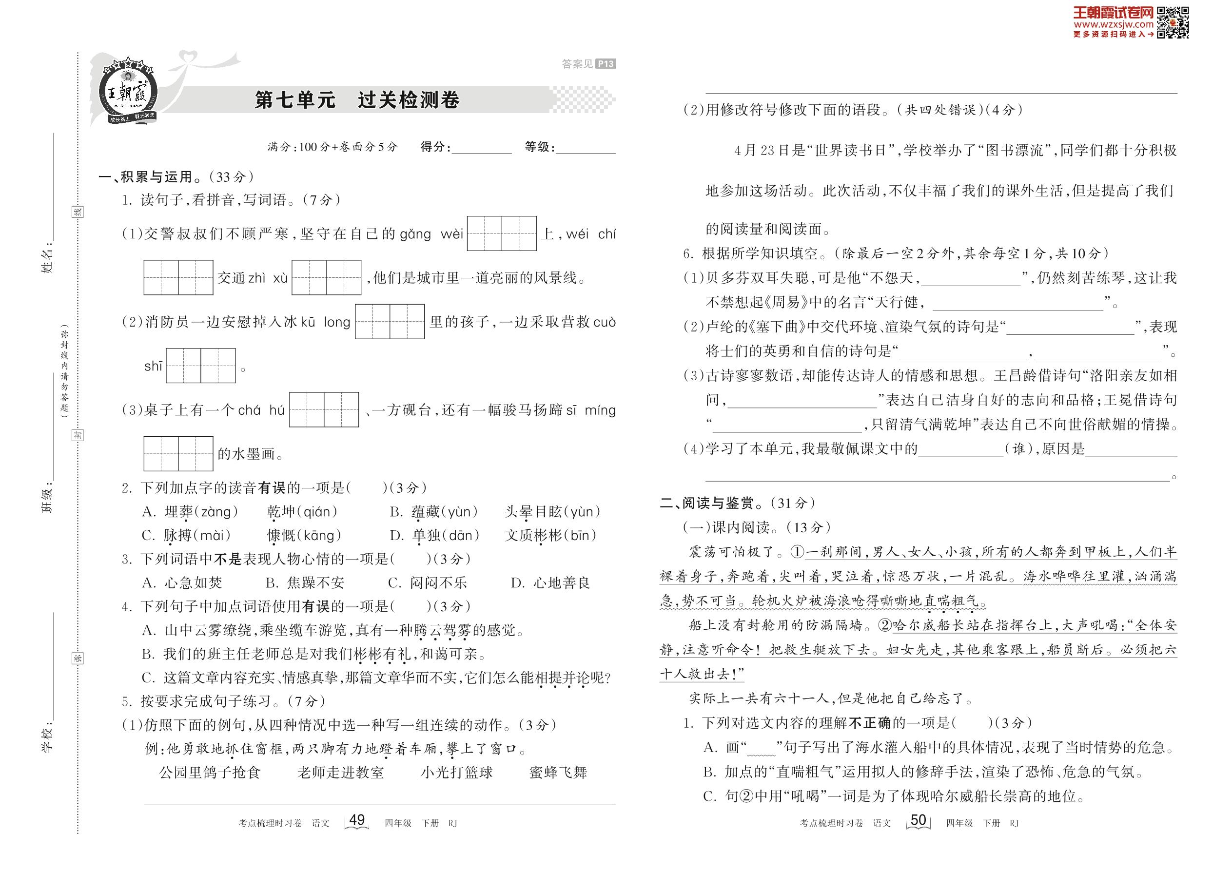 2023下册四年级语文人教版 第七单元 过关检测卷