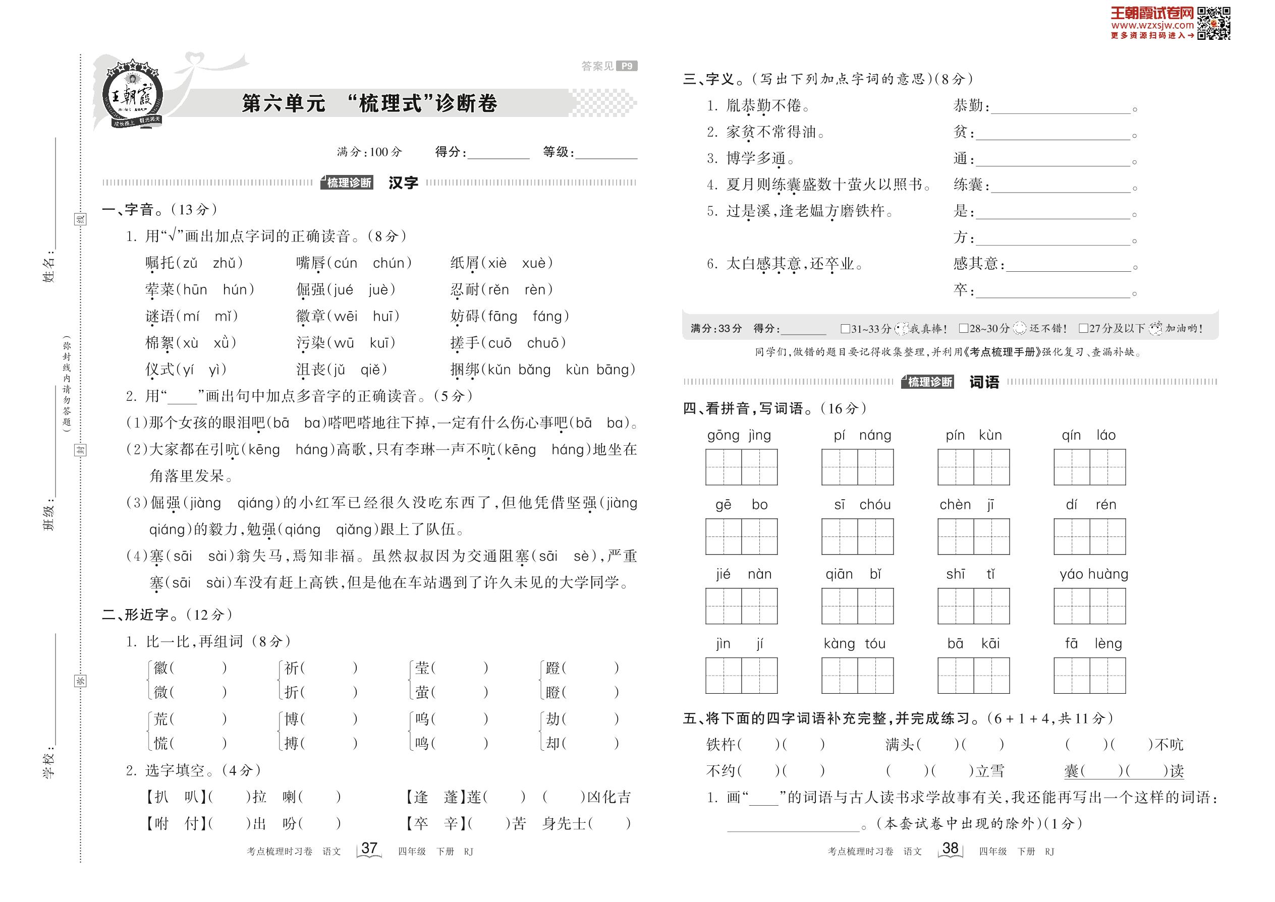 2023下册四年级语文人教版 第六单元 “梳理式”诊断卷