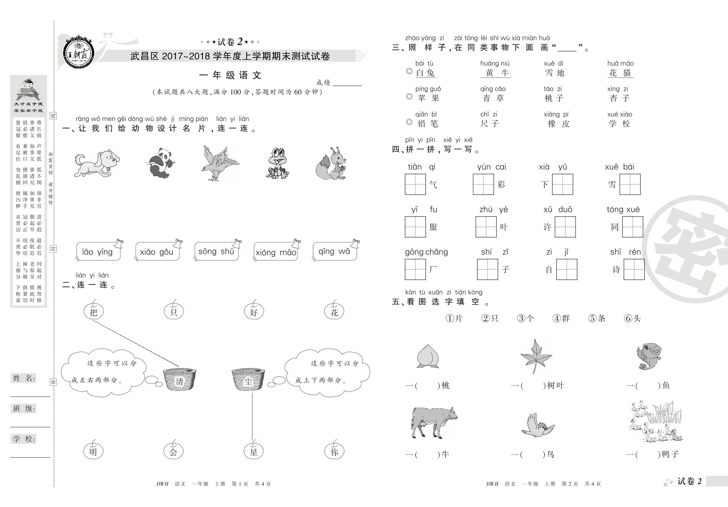 2017-2018学年第一学期武汉市武昌区一年级语文试卷(人教版)【2】