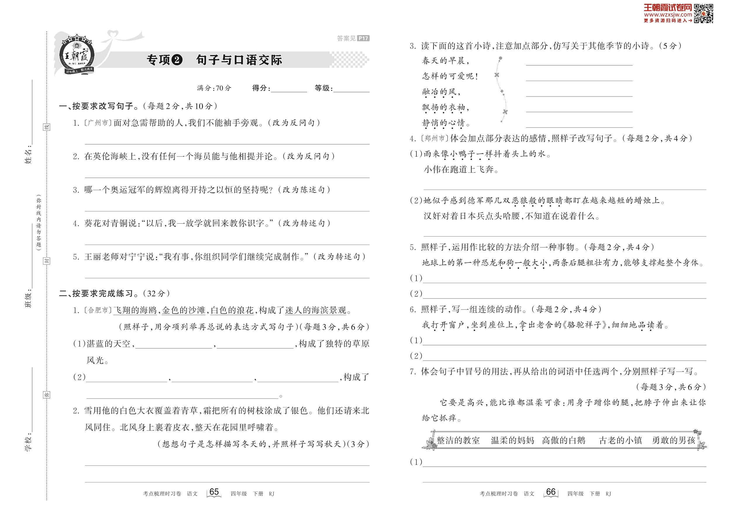 2023下册四年级语文人教版 专项2 句子与口语交际