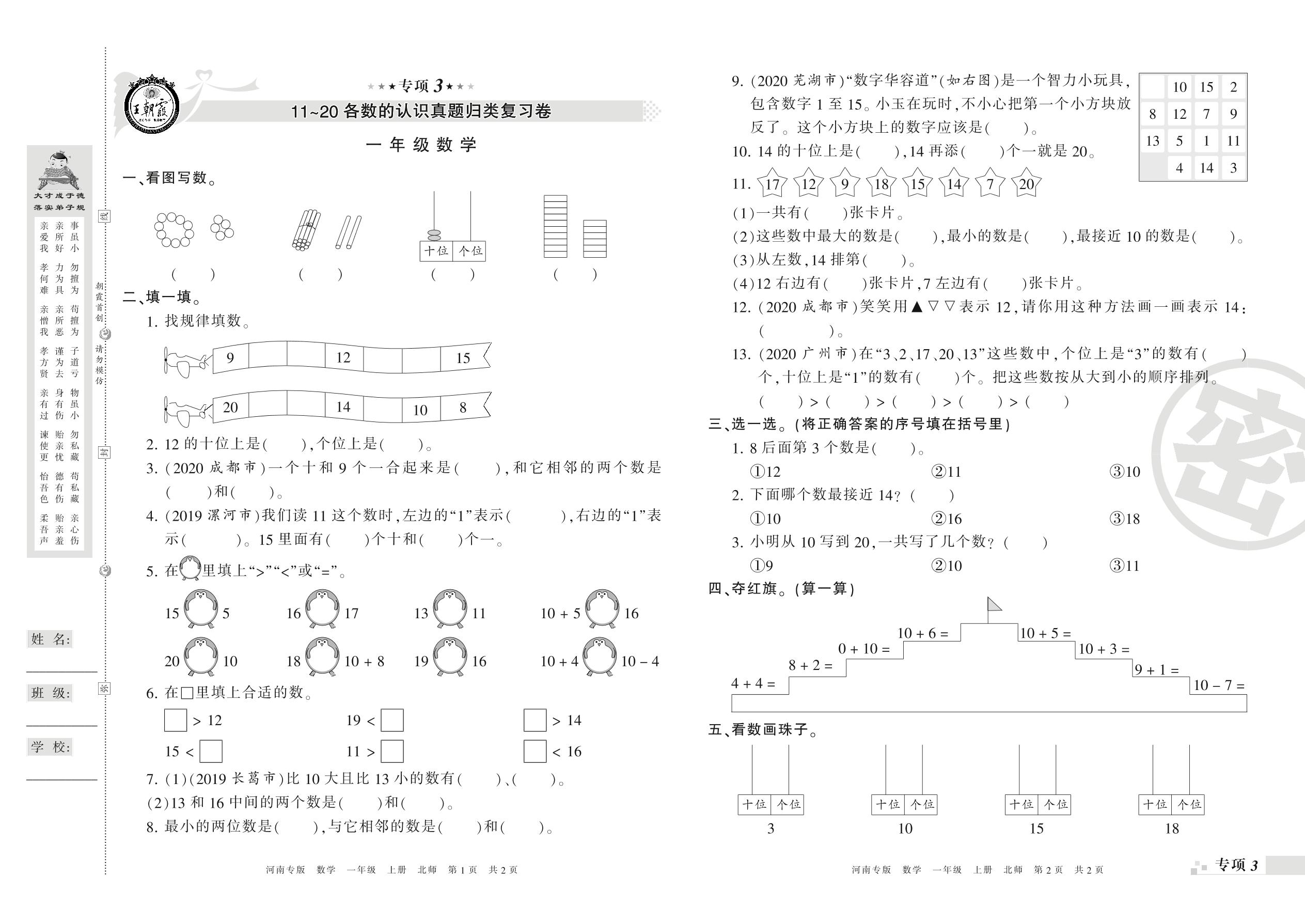 王朝霞期末专项卷——10~20各数的认识、20以内不进退位加减法真题归类复习一年级上册数学(北师版)【0】