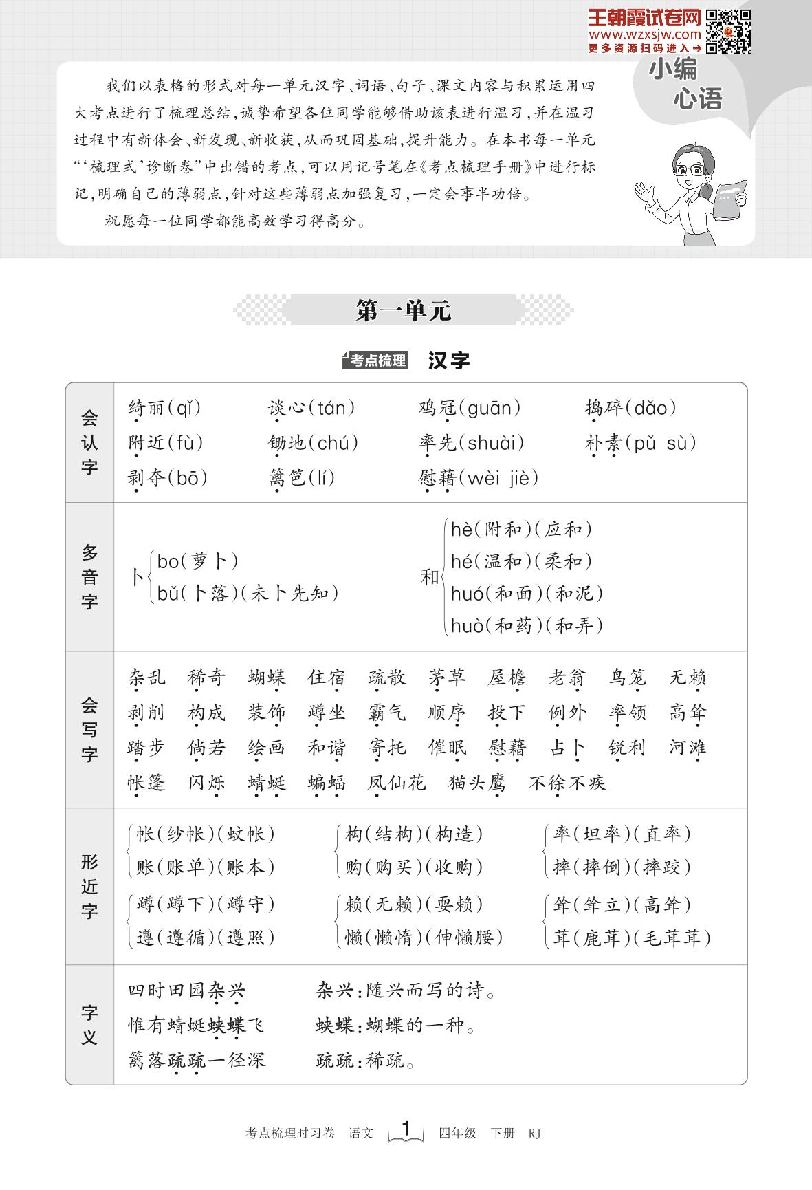 2023下册四年级语文人教版 考点梳理手册——第一单元