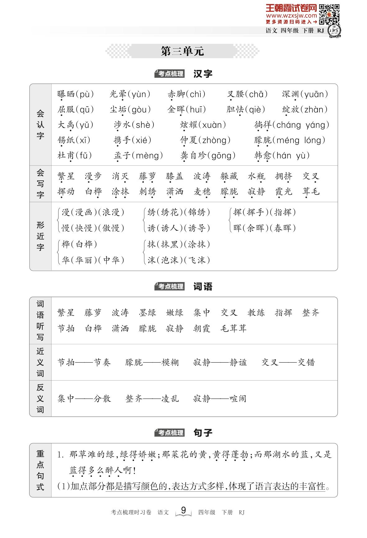 2023下册四年级语文人教版 考点梳理手册——第三单元