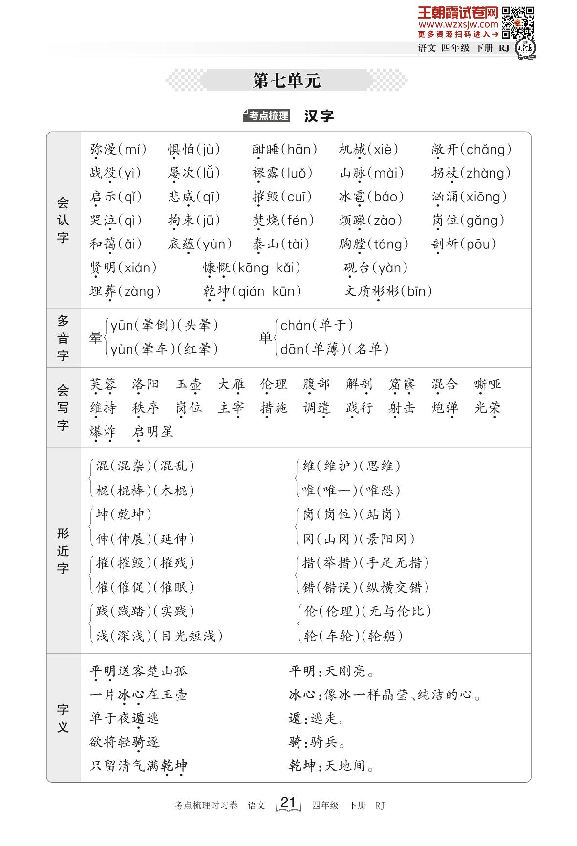 2023下册四年级语文人教版 考点梳理手册——第七单元