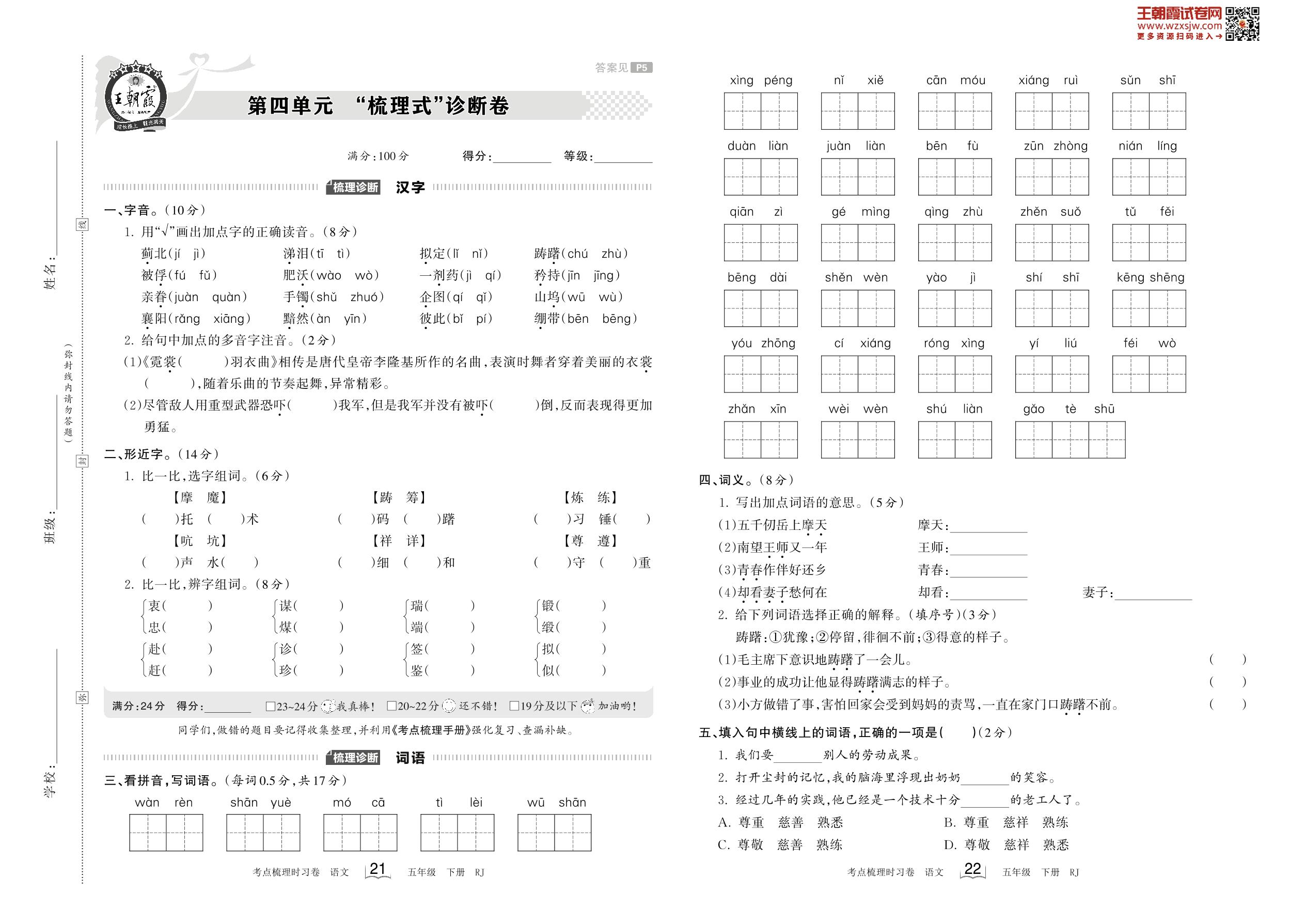 2023下册五年级语文人教版 第四单元 “梳理式”诊断卷