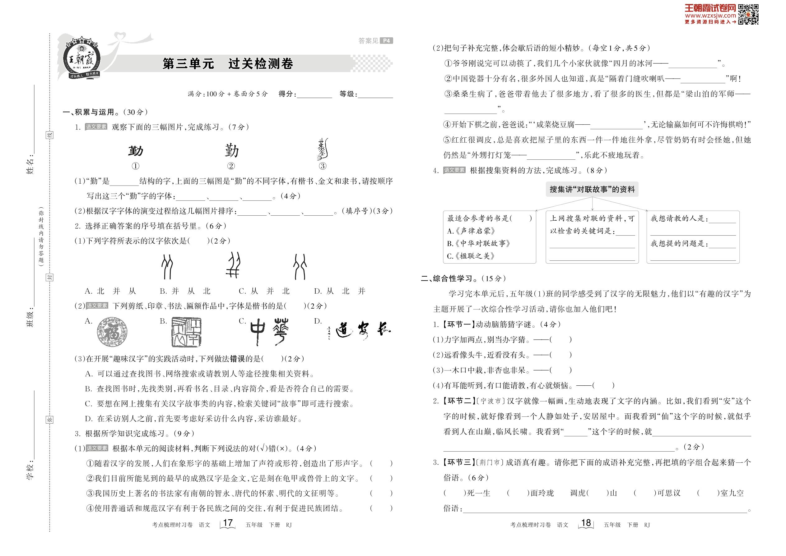 2023下册五年级语文人教版 第三单元 过关检测卷