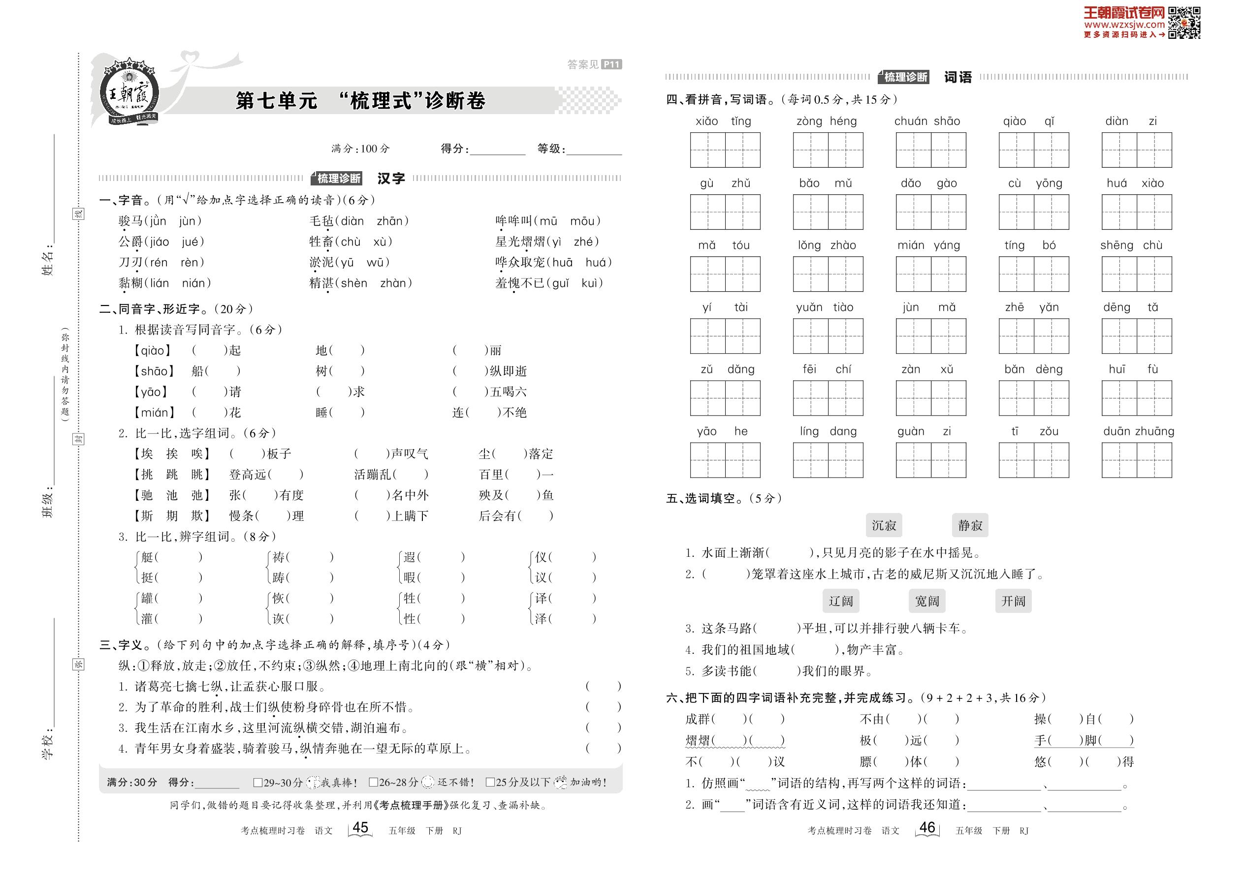 2023下册五年级语文人教版 第七单元 “梳理式”诊断卷