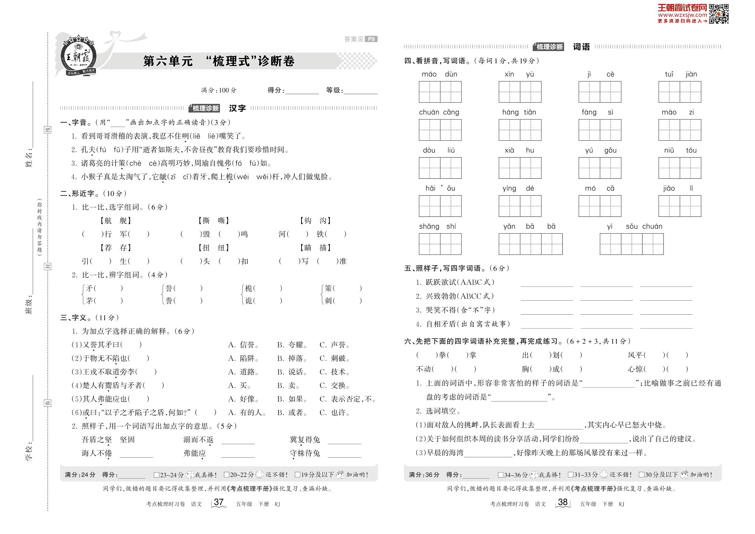 2023下册五年级语文人教版 第六单元 “梳理式”诊断卷