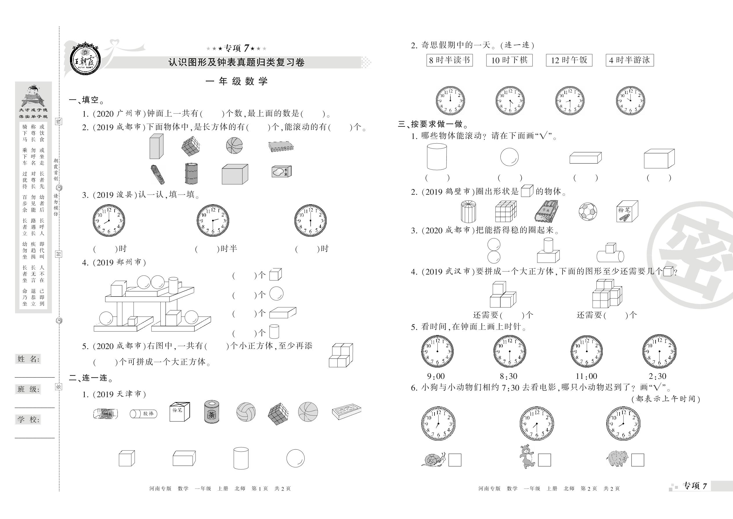 王朝霞期末专项卷——认识图形及钟表真题归类复习、新颖题速递:生活与数学一年级上册数学(北师版)【0】