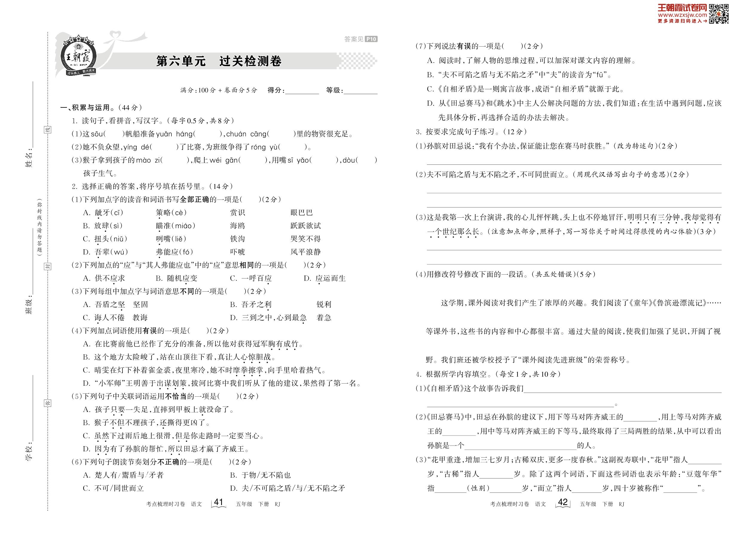 2023下册五年级语文人教版 第六单元 过关检测卷