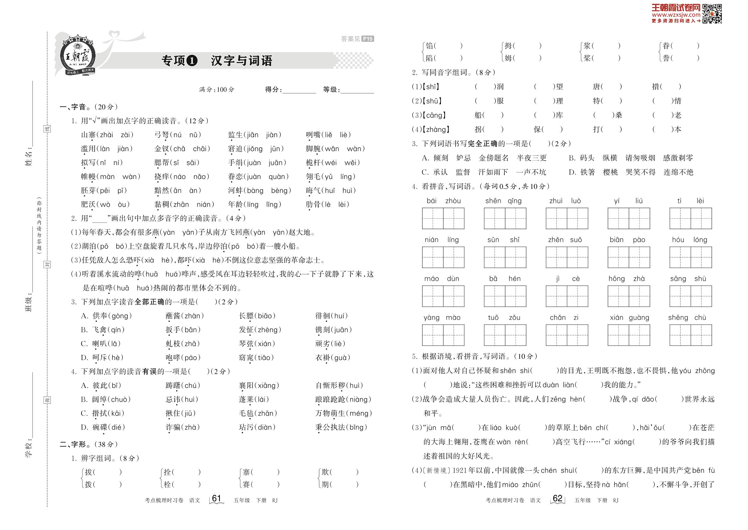 2023下册五年级语文人教版 专项1 汉字与词语