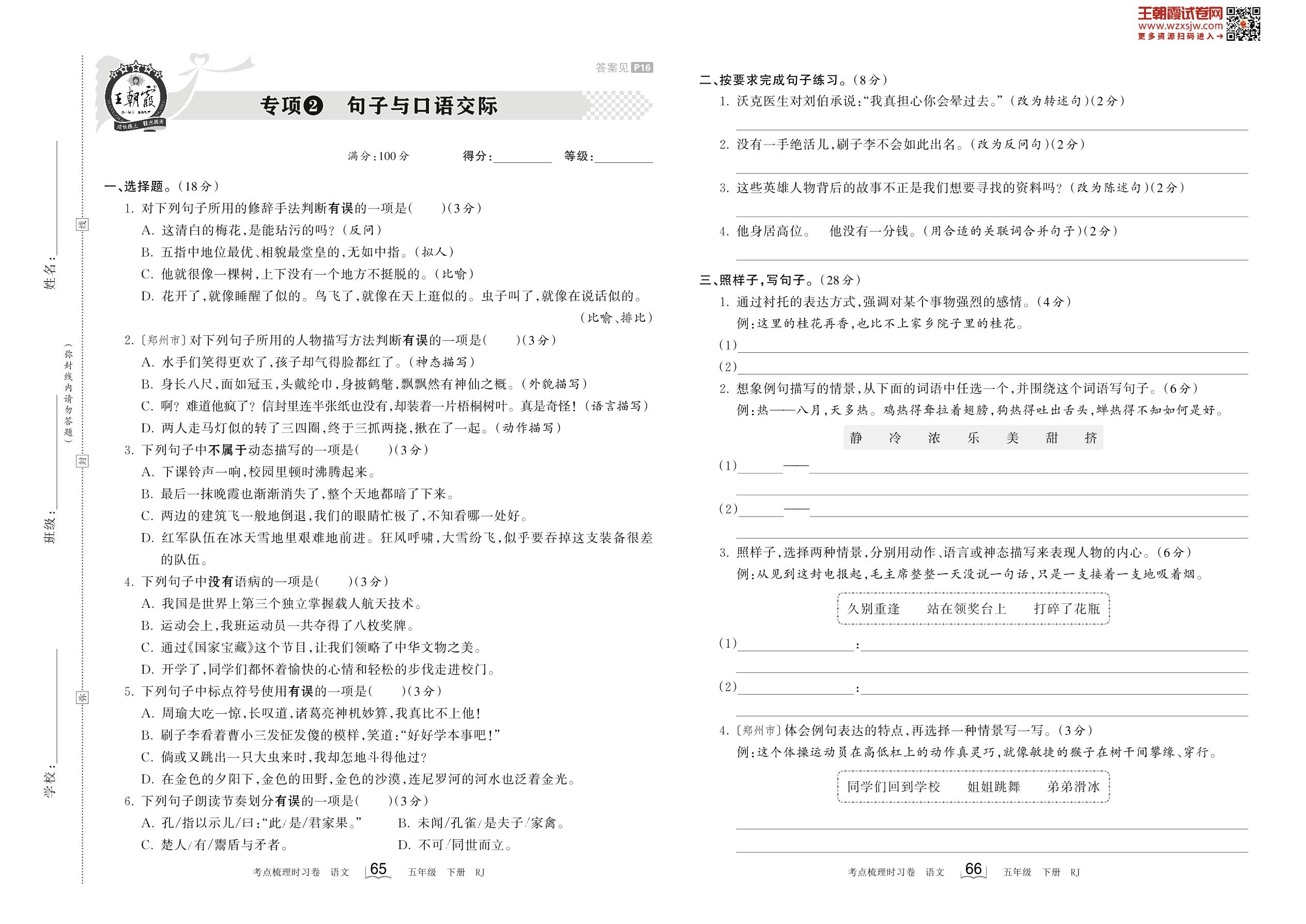 2023下册五年级语文人教版 专项2 句子与口语交际
