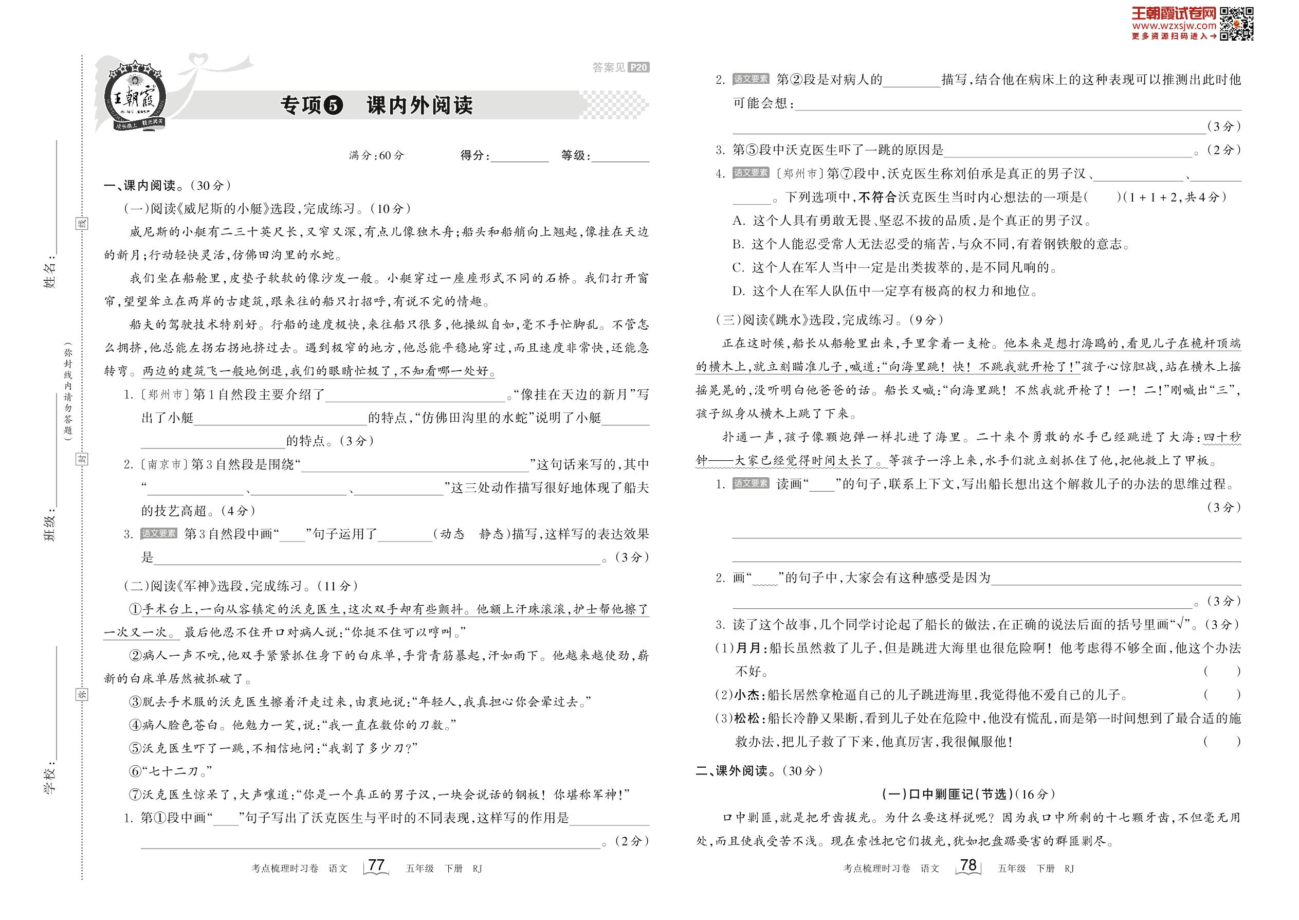 2023下册五年级语文人教版 专项5 课内外阅读