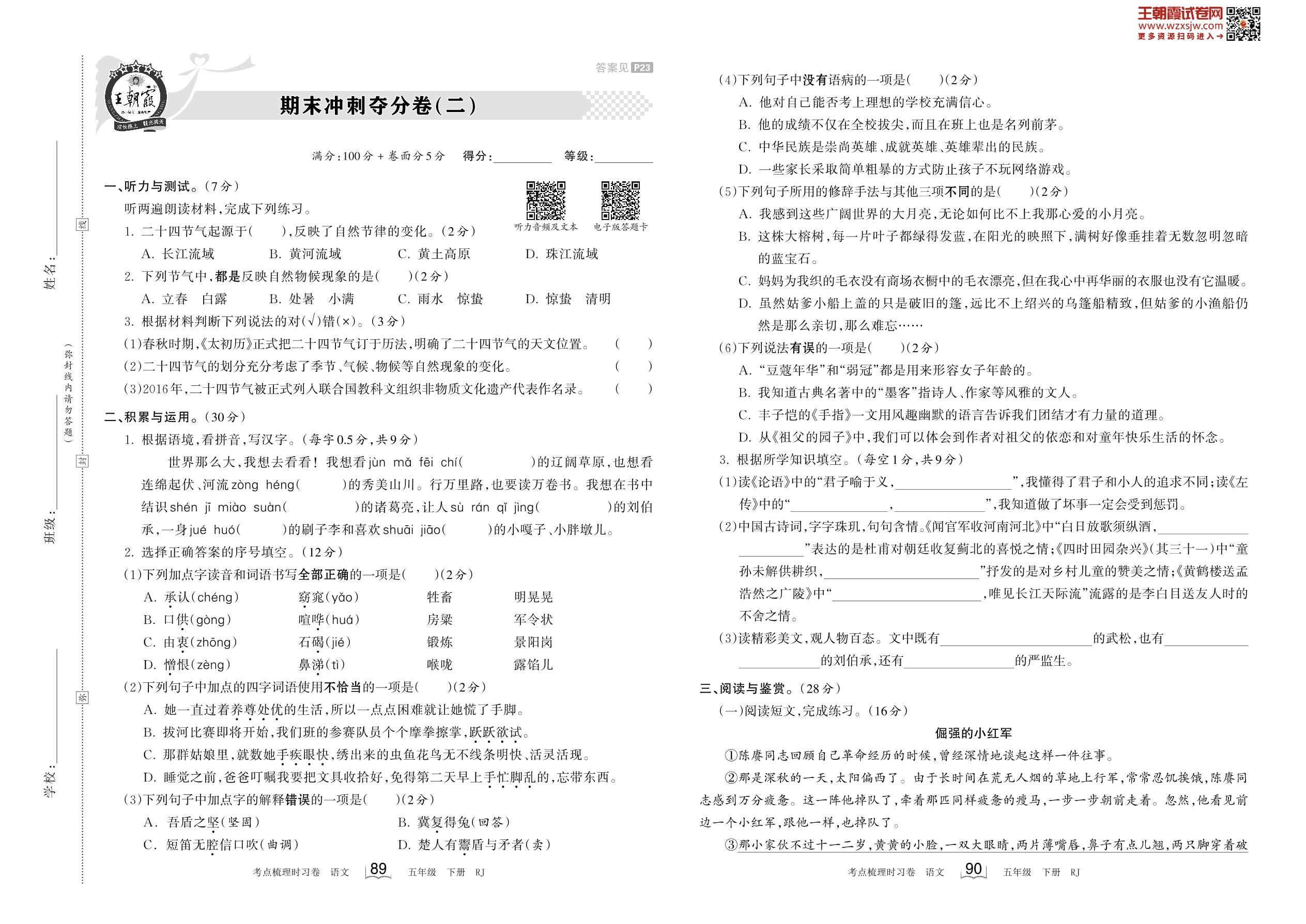 2023下册五年级语文人教版 期末冲刺夺分卷(二)