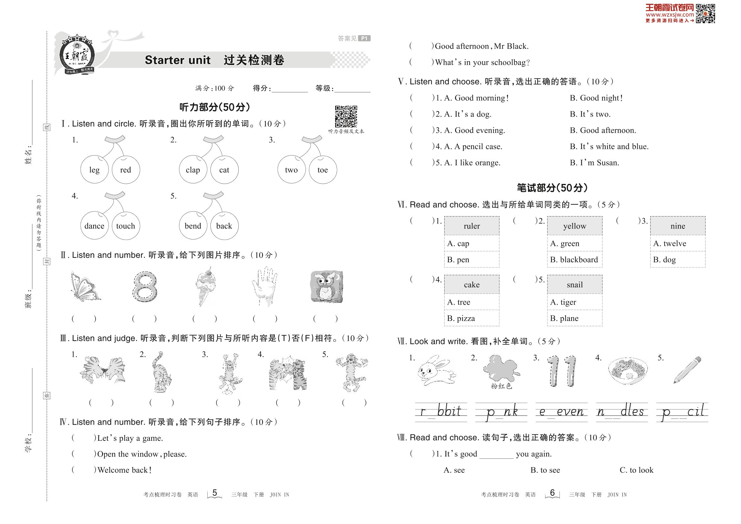 2023下册三年级英语剑桥版 Starter unit 过关检测卷