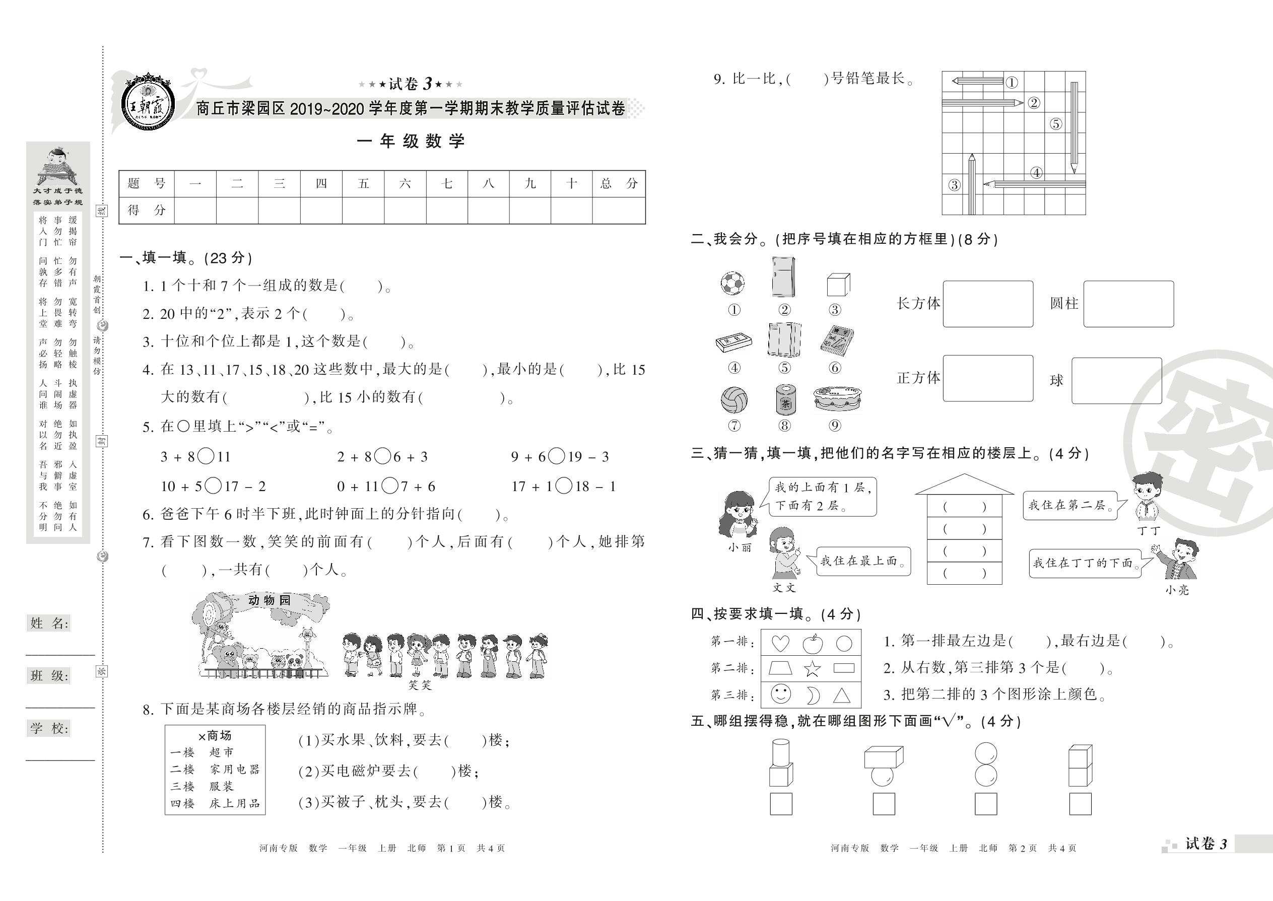 2019-2020学年第一学期商丘市梁园区一年级数学试卷(北师版)【3】