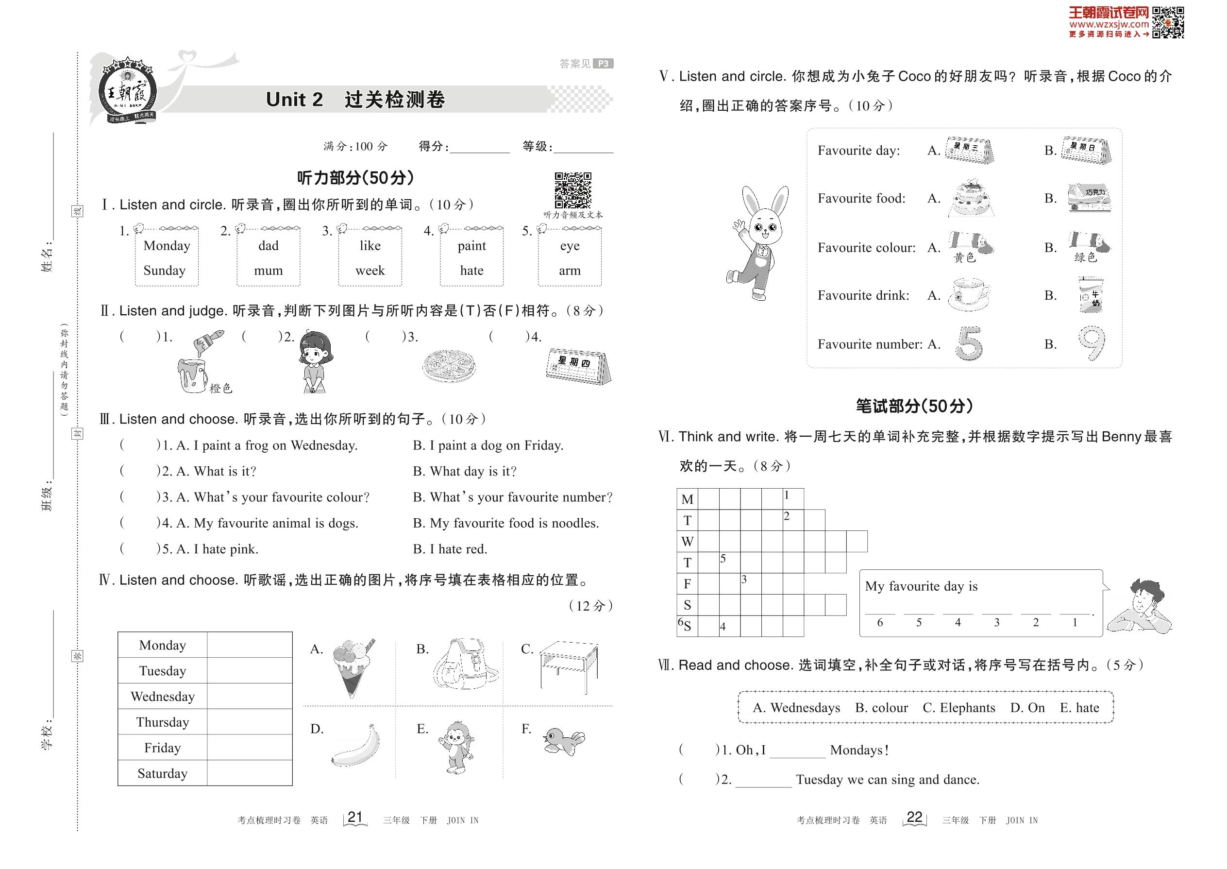 2023下册三年级英语剑桥版 Unit 2 过关检测卷