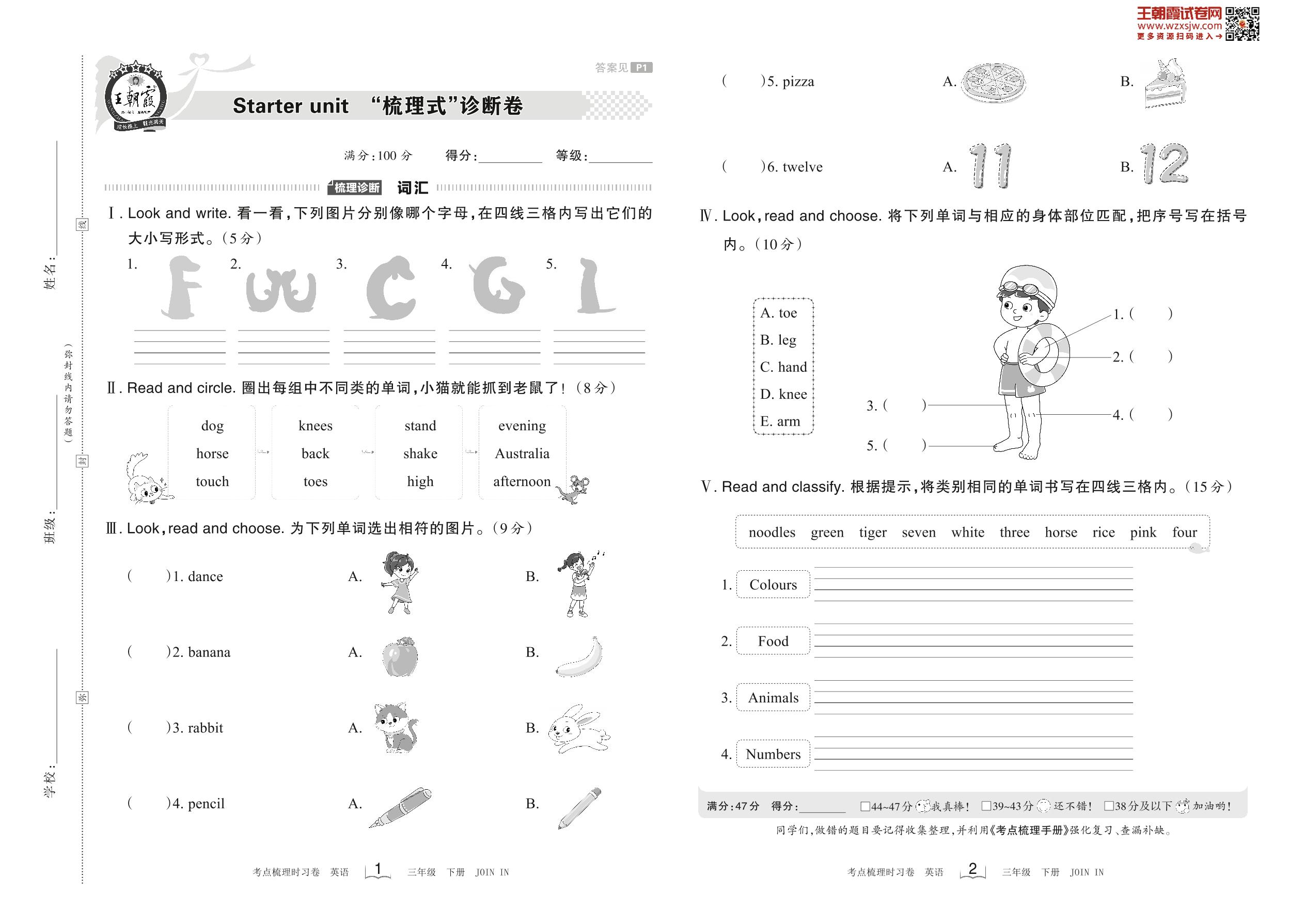 2023下册三年级英语剑桥版 Starter unit “梳理式”诊断卷