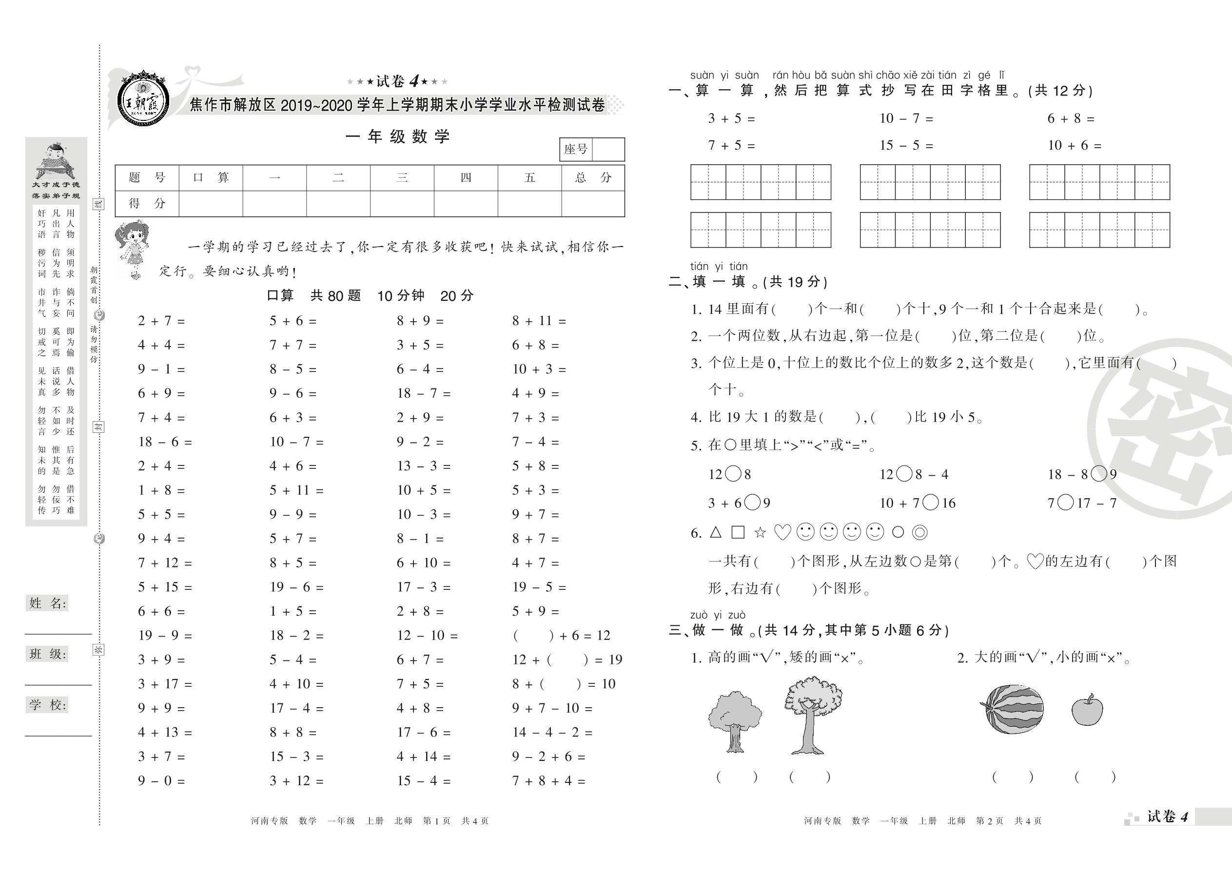 2019-2020学年第一学期焦作市解放区一年级数学试卷(北师版)【4】