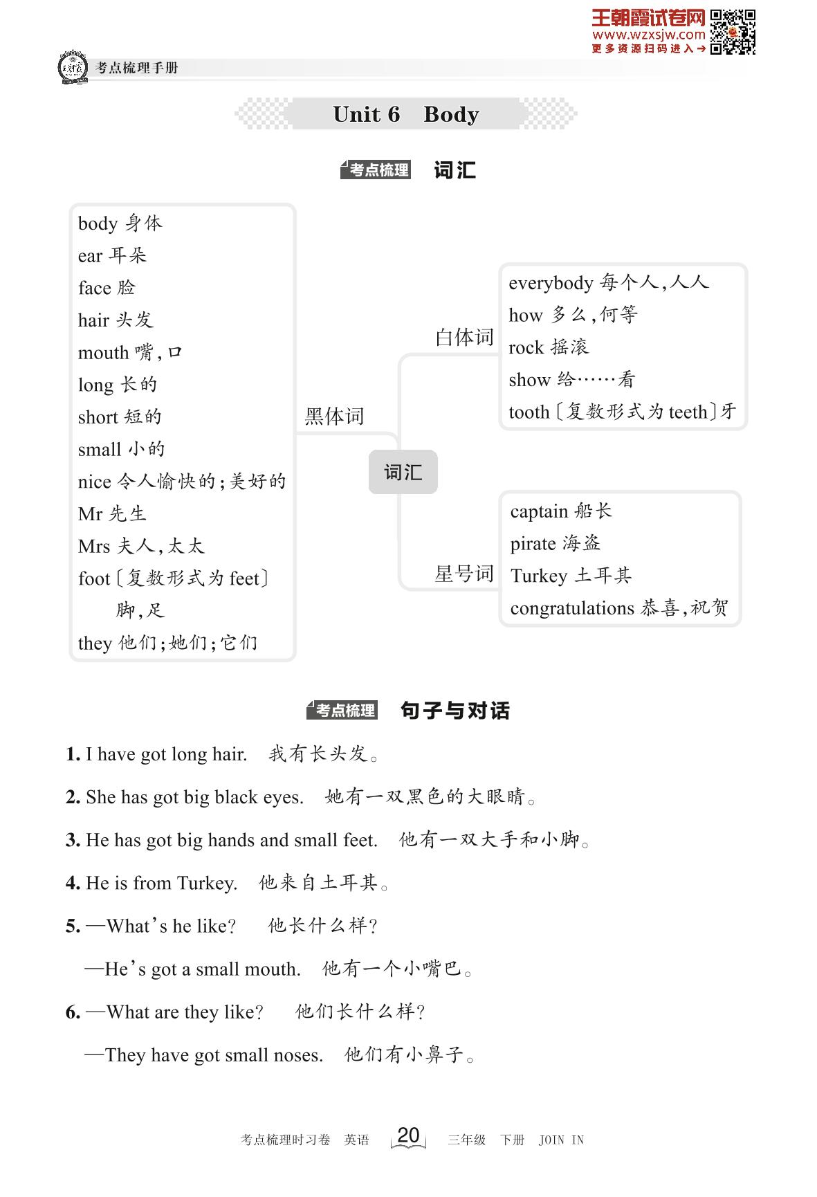 2023下册三年级英语剑桥版 考点梳理手册——Unit 6 Body