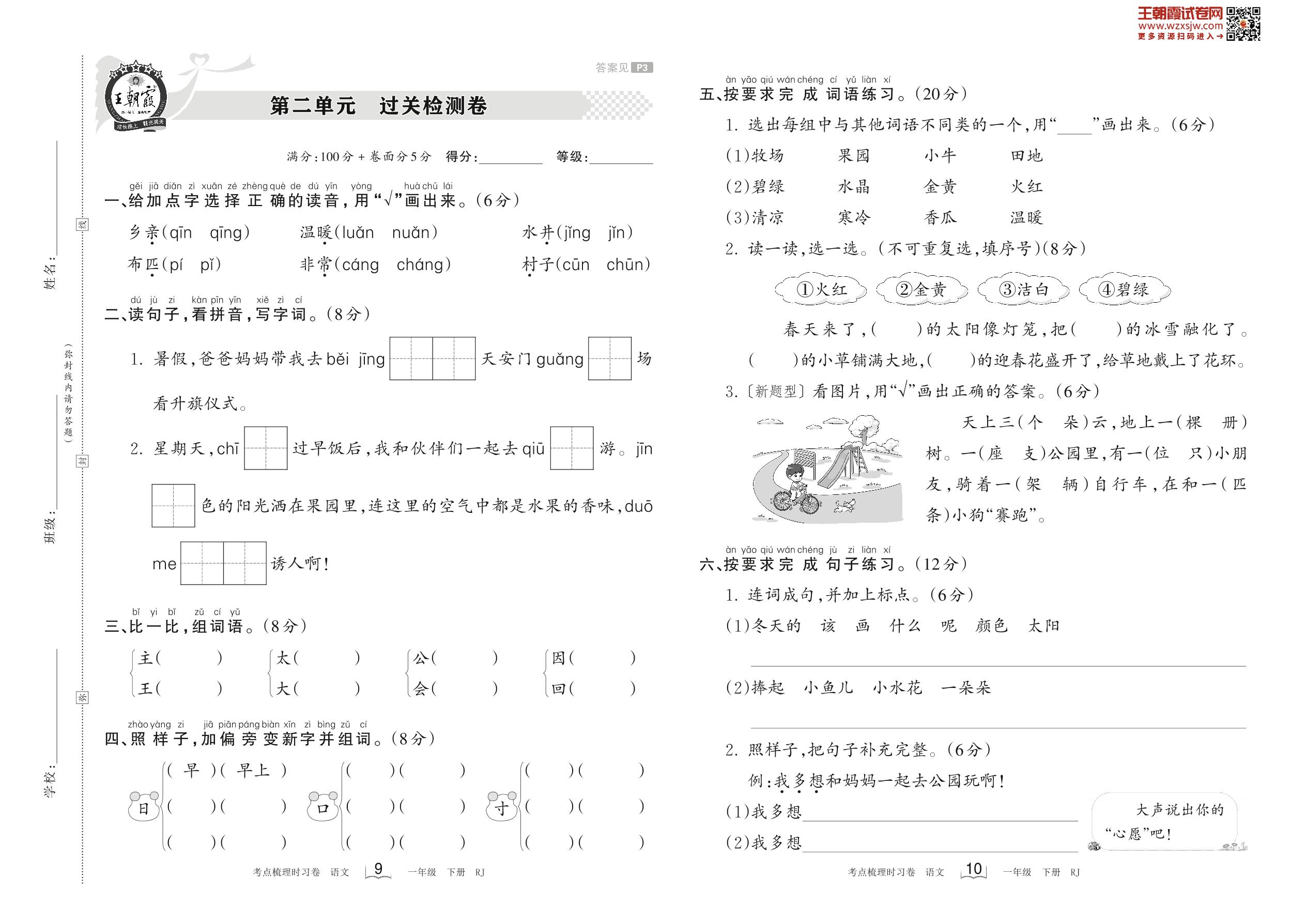 2023下册一年级语文人教版 第二单元 过关检测卷
